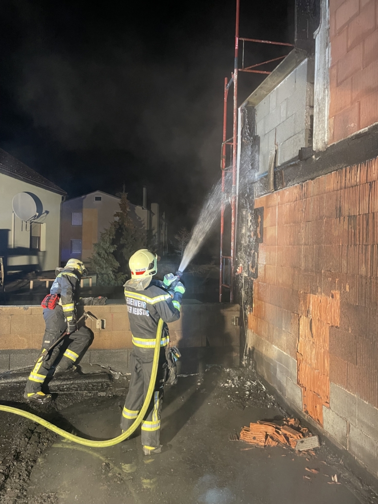Der schwerwiegendste Einsatz ereignete sich gegen 01.00 Uhr in der Pottendorfer Straße. An einer Baustelle entzündete sich in einem unzugänglichen Dachbereich am Rohbau aufgetragene Teerpappe. Das Feuer konnte sich auf dem leicht entzündlichen Material am gesamten Terrassenbereich rasch ausbreiten und erreichte beim Eintreffen des ersten Feuerwehrfahrzeuges bereits die angrenzenden Fassadenteile. Während die ersteintreffende Mannschaft die ersten Löschmaßnahmen begann, wurden weitere Ergänzungskräfte zum Einsatz alarmiert. Ursprünglich gemeldet wurde lediglich ein Flurbrand.