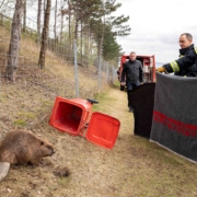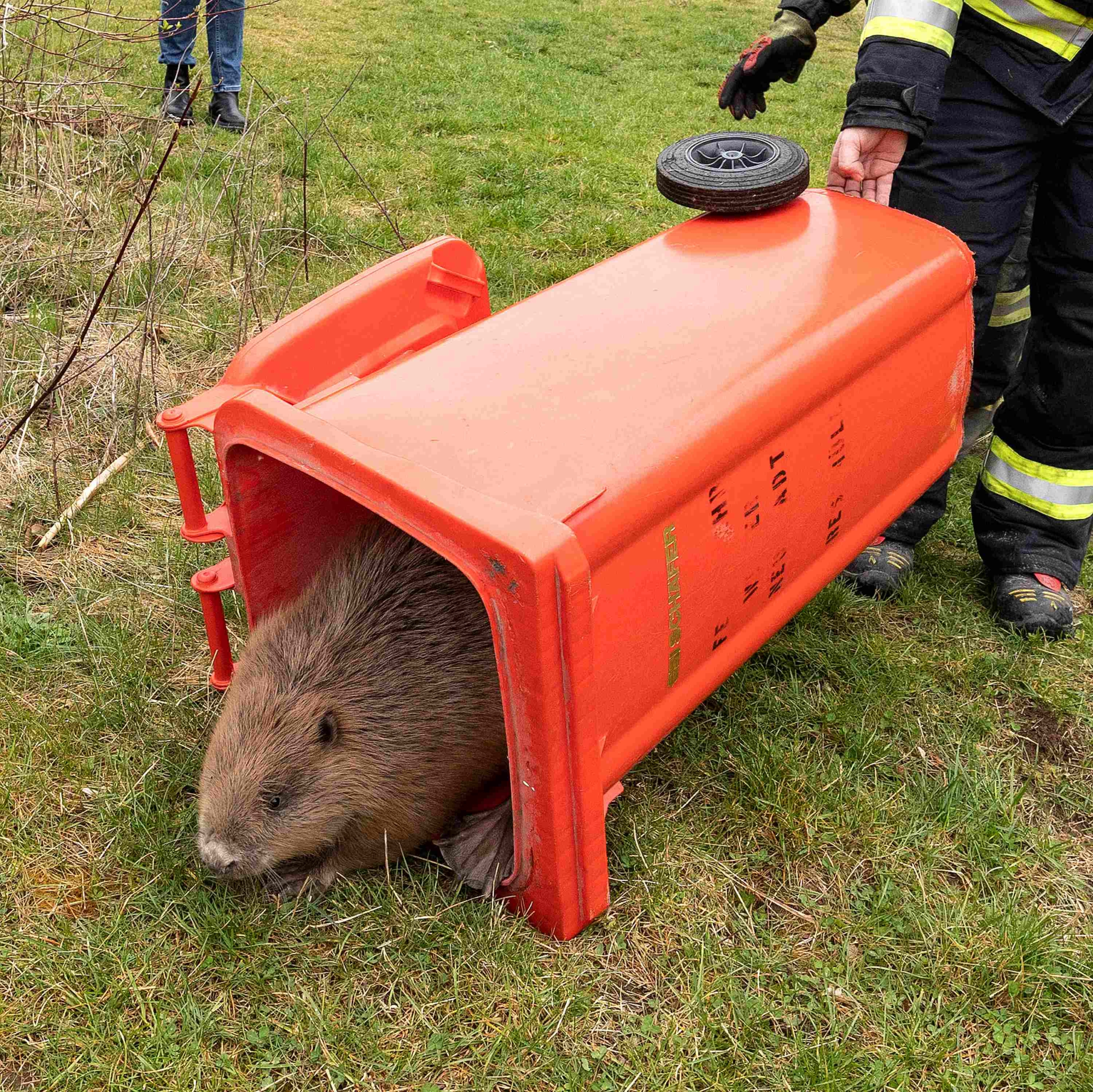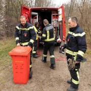 Nach einem Briefing in der Feuerwehrzentrale wurde die anwesende Hausmannschaft zum Einsatzort entsandt. Zuvor hat man noch eine saubere Mülltonne aus der Fahrzeughalle in eines der beiden Einsatzfahrzeuge geladen. „Unsere Tierrettungsbox hätte der Biber sofort zerlegt. Diese kraftvollen Tiere lassen sich von Boxen, die nur mit Scharnieren zusammengehalten werden, nicht beeindrucken“, so Pfeiffer.
