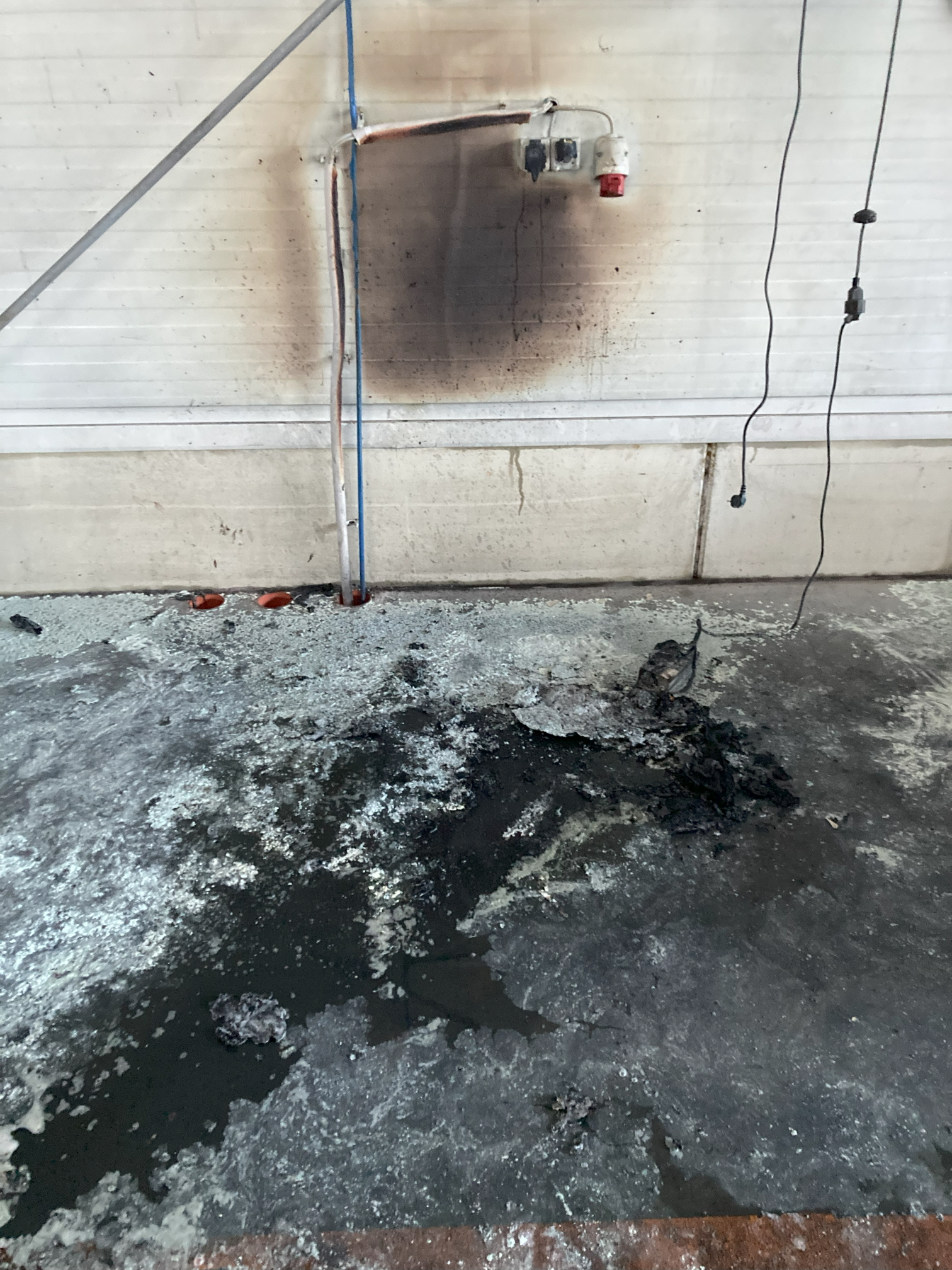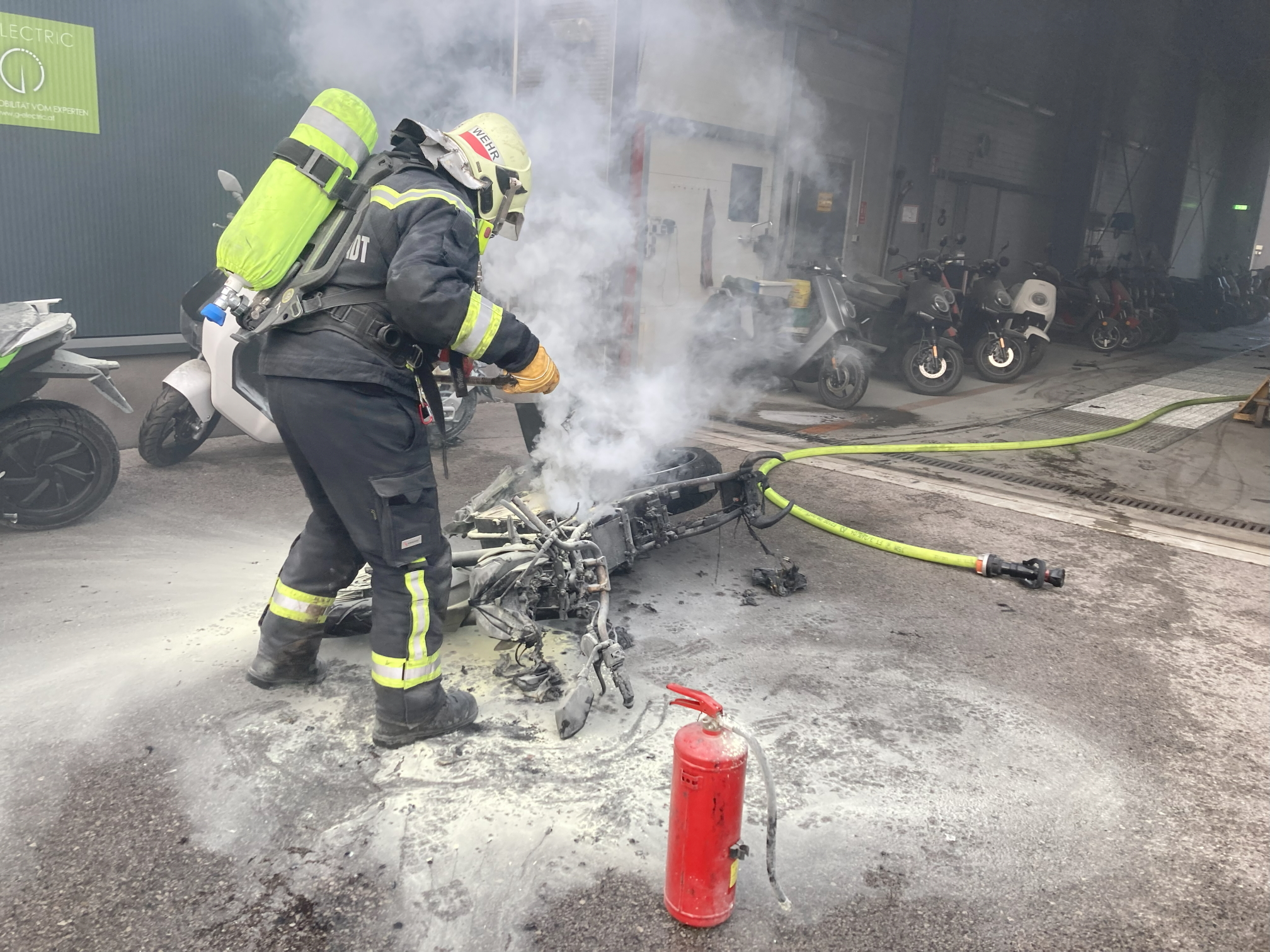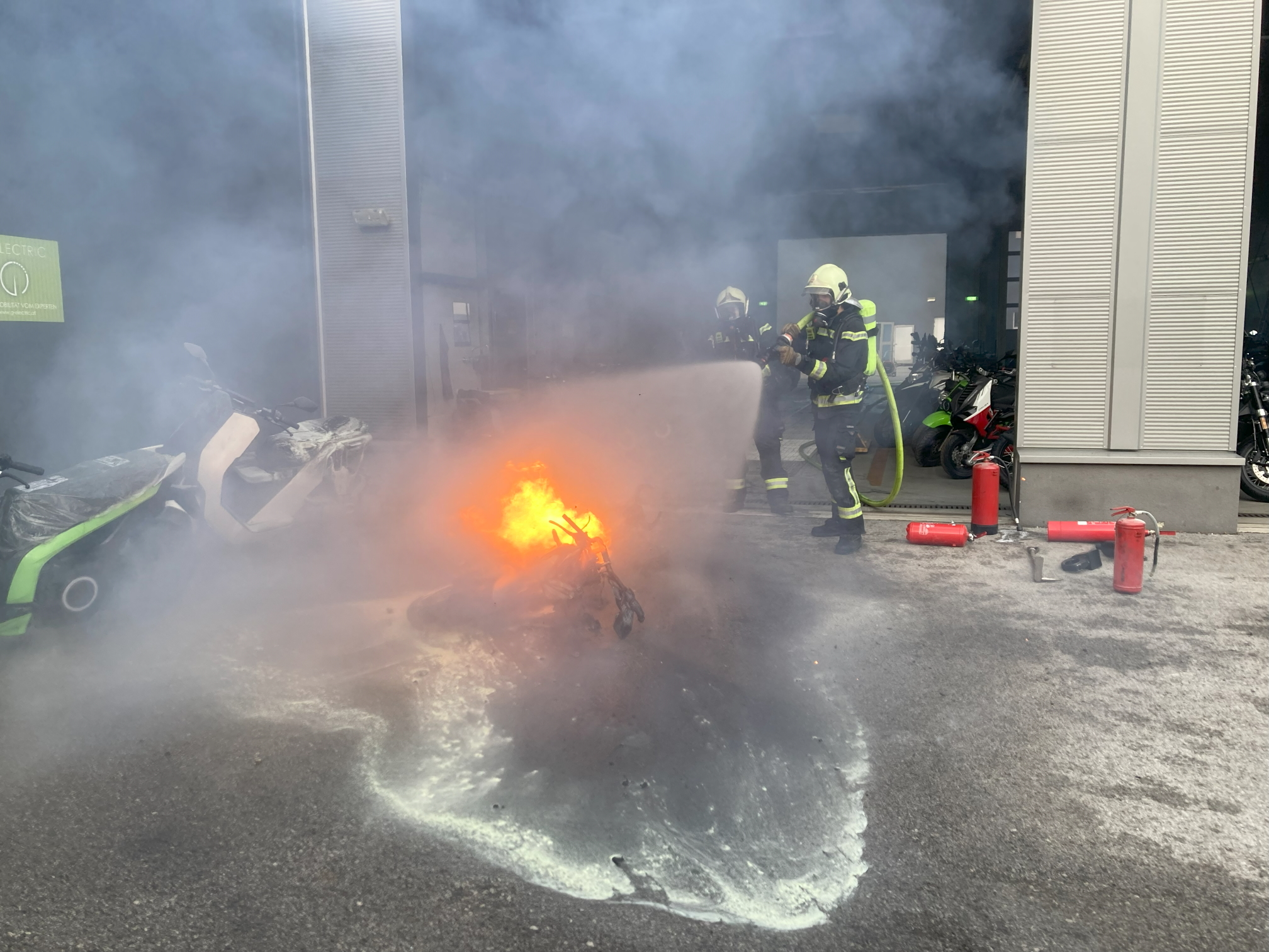 Außerhalb der Halle entzündete sich das Elektrofahrzeug mehrfach erneut und musste immer wieder gelöscht werden. Erst, nachdem das Motorrad in einer extra herangeschafften Wanne der Feuerwehr gänzlich im Wasser versenkt worden war, konnte der Brand nachhaltig gelöscht werden.