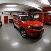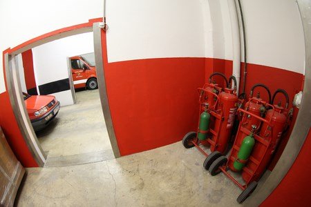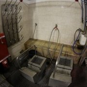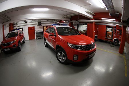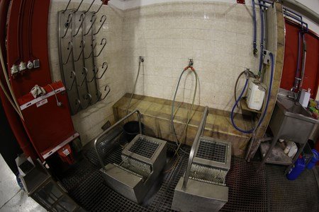 Hinter den beidne Kommandofahrzeugen im vorderen Bereich sind auch die Messgeräte in einem Kasten stationiert. Eine Stiefelwaschanlage im Bereich vor dem Eingang zu den Garderoben sorgt dafür, dass der Schmutz vom Einsatz nicht in die Spindräume gelangt.