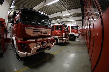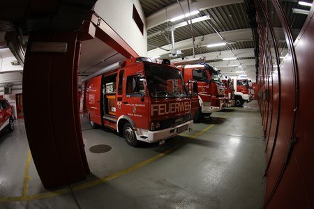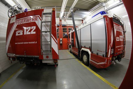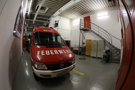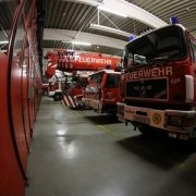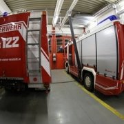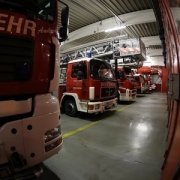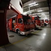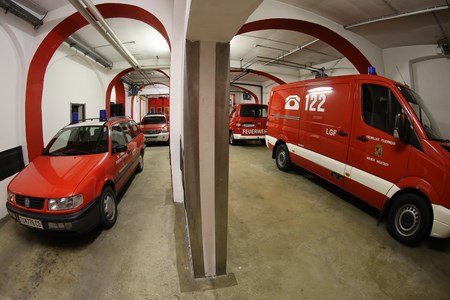 In der Fahrzeughalle stehen die Fahrzeuge. Aufgrund der Platzverhältnisse mussten auch Fahrzeuge im Zubau untergebracht werden. Hier im Hauptgebäude sind jene Fahrzeuge abgestellt, welche für den ersten Einsatz benötigt werden.