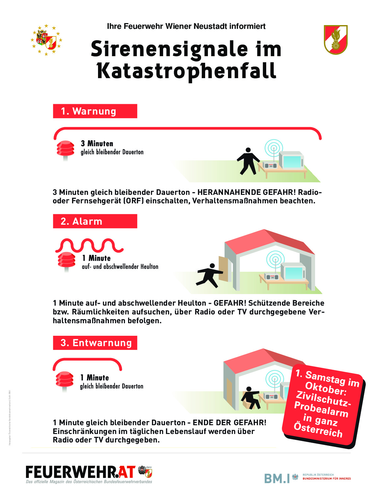 Der Zivilschutzalarm wird durch die Bezirksalarm- und -warnzentrale am Babenbergerring ausgelöst. Jeden ersten Samstag im Oktober werden alle drei Zivilschutzalarmsignale getestet. Jeden Samstag um 12:02 Uhr wird die wöchentliche Probe mit 15 Sekunden durchgeführt.