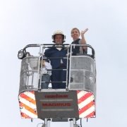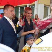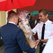 Kommandant Josef Bugnar gratulierte mit Kameraden unserem Michael Leitgeb und seiner Ines zur Vermählung am 5. September 2015. Dem sichtbar glücklichem Brautpaar überreichte vor dem Standesamt direkt beim Feuerwehrhaus in Bad Erlach einen Strauß Blumen sowie einen handgeschnitzten Florian. Danach wurde das Brautpaar mit der Drehleiter in luftige Höhen gebracht.