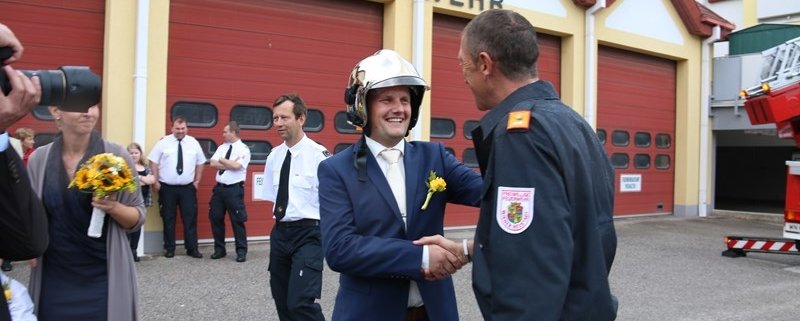 Eine Delegation der Feuerwehr Wiener Neustadt gratulierte heute Kamerad Michael Leitgeb uns seiner Ines zur Hochzeit in Bad Erlach.