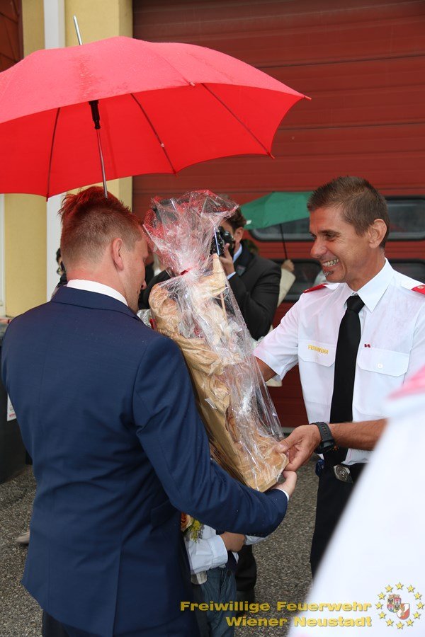 Eine Delegation der Feuerwehr Wiener Neustadt gratulierte heute Kamerad Michael Leitgeb uns seiner Ines zur Hochzeit in Bad Erlach.