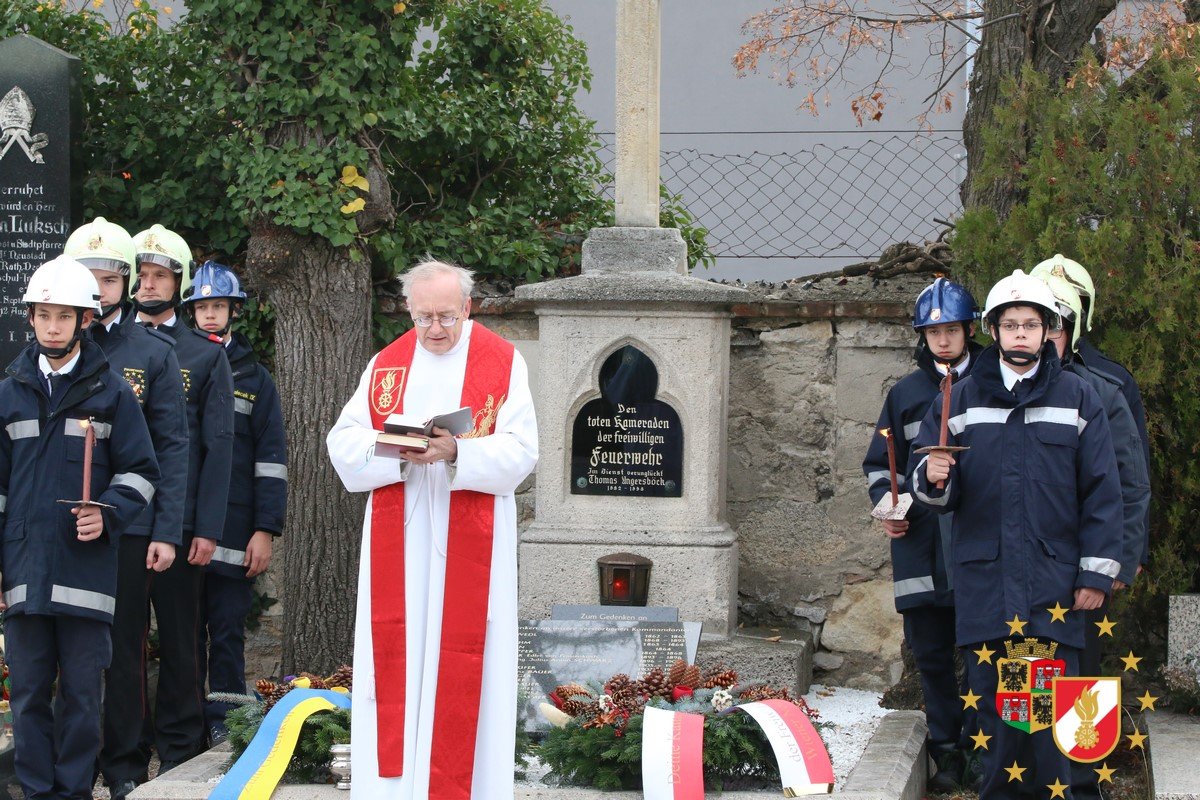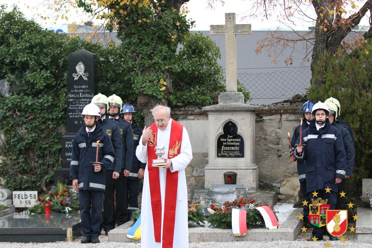 Geleitet von Prior Pater Walter Ludwig führte das Kommando den Ehrenzug zum Grab des am 5. Dezember 1998 viel zu früh im Einsatz verstorbenen Kameraden Thomas Ungersböck, wo alljährlich ein Kranz niedergelegt wird. Dann wurden wie jedes Jahr am Ehrengrab der Freiwilligen Feuerwehr Wiener Neustadt zwei Kränze niedergelegt und Pater Walter fand einfühlsame Worte über die Wichtigkeit der Erinnerung an unsere Verstorbenen Kameraden.