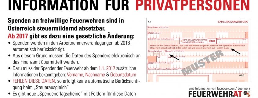 Bei Spenden, die ab 2017 zugehen, muss der Spender / die Spenderin neben dem Vor- und Zunamen auch das Geburtsdatum bekannt geben; fehlt eine dieser Angaben darf die Feuerwehr dies als Erklärung betrachten, dass die Spende nicht von der Steuer abgesetzt werden will. Bei Spenden über Erlagschein muss ein eigener Spendenerlagschein verwendet werden, der auch eine Angabe des Geburtsdatums vorsieht.