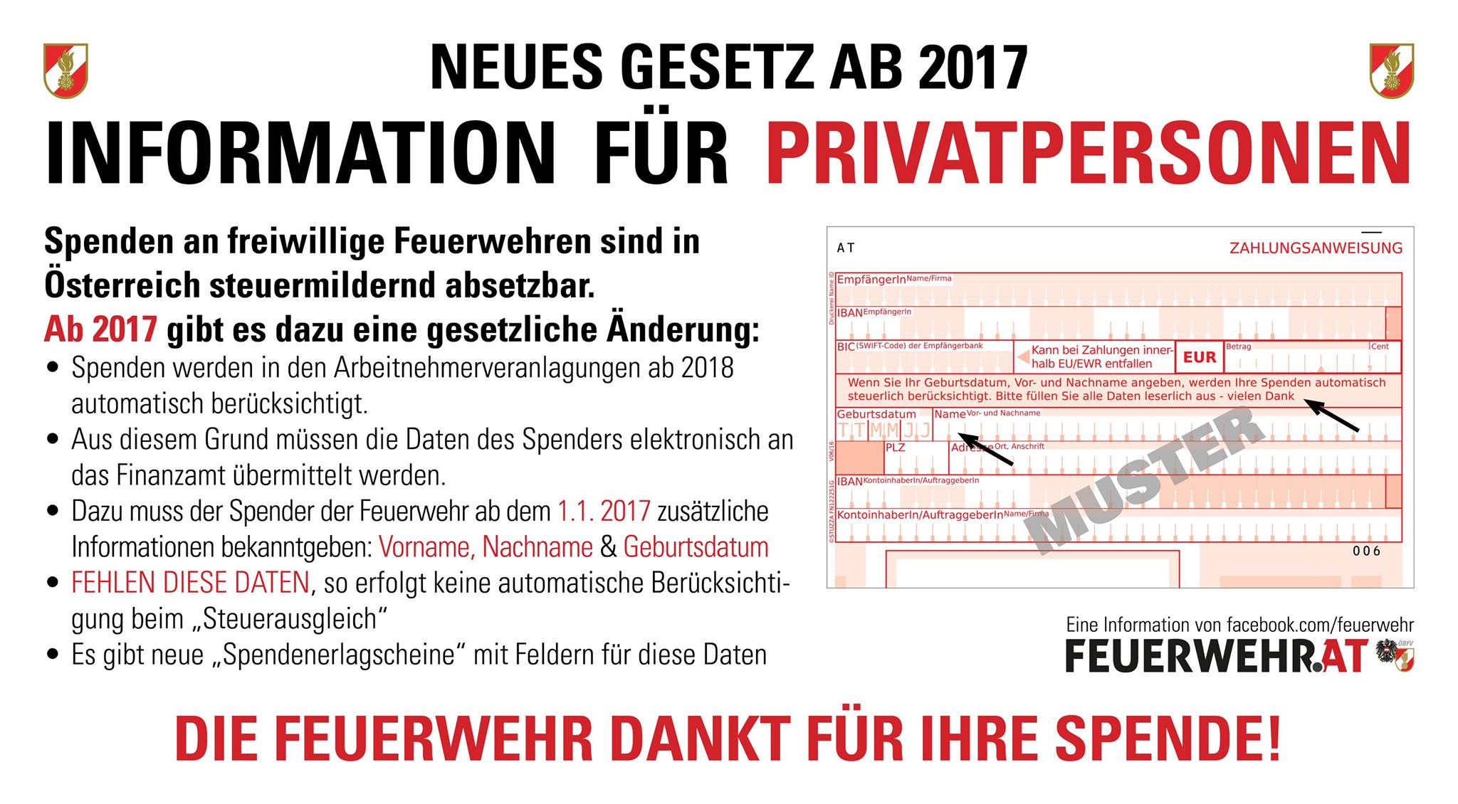 Bei Spenden, die ab 2017 zugehen, muss der Spender / die Spenderin neben dem Vor- und Zunamen auch das Geburtsdatum bekannt geben; fehlt eine dieser Angaben darf die Feuerwehr dies als Erklärung betrachten, dass die Spende nicht von der Steuer abgesetzt werden will. Bei Spenden über Erlagschein muss ein eigener Spendenerlagschein verwendet werden, der auch eine Angabe des Geburtsdatums vorsieht.