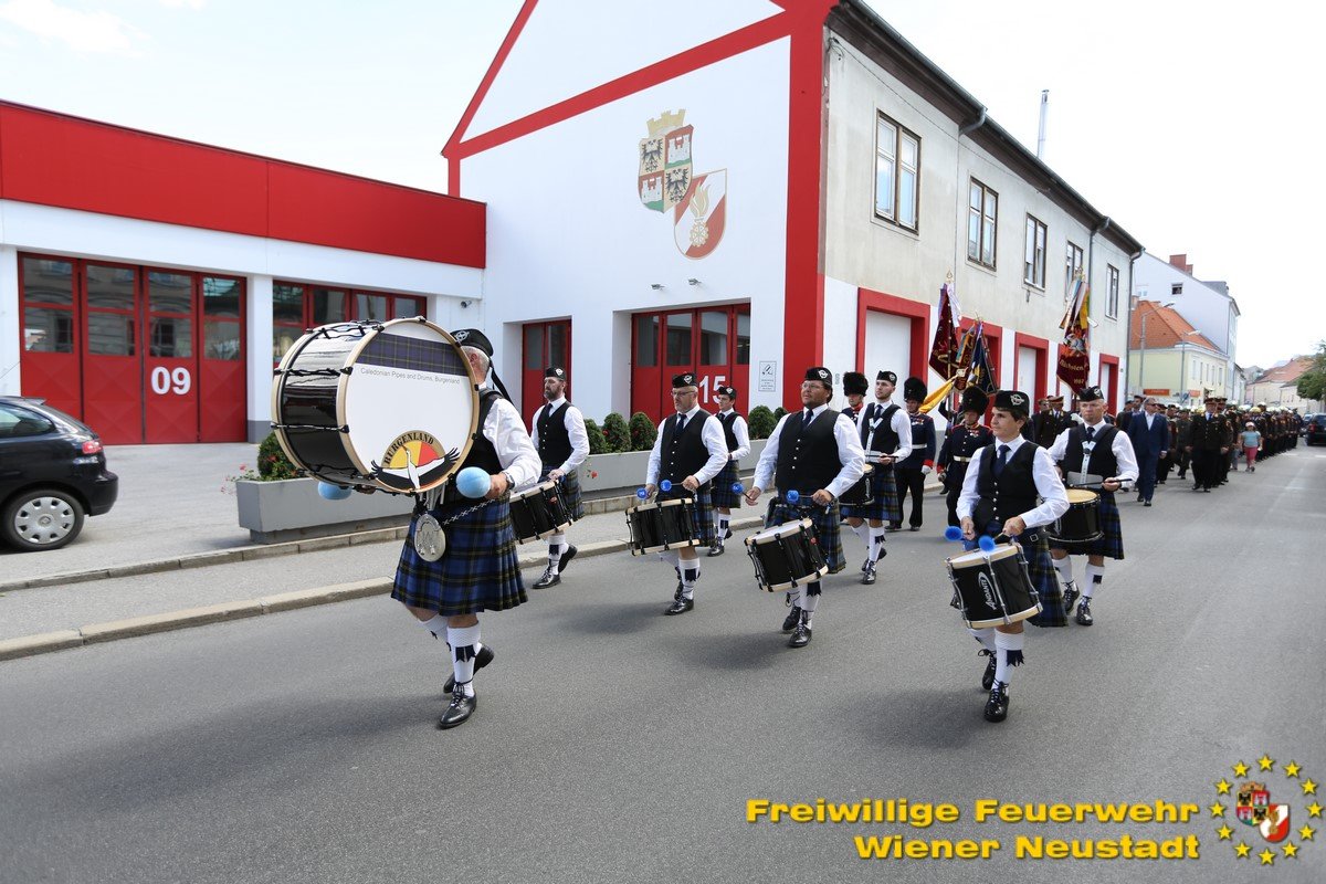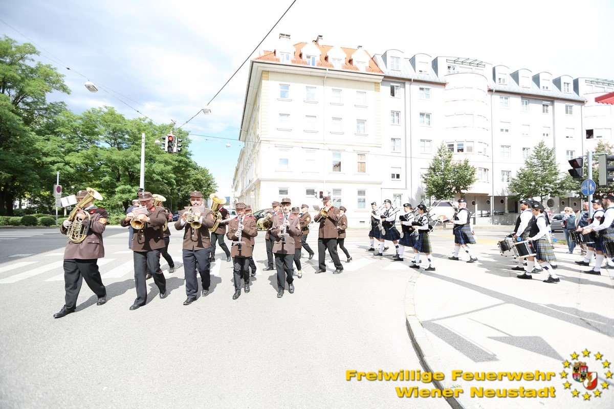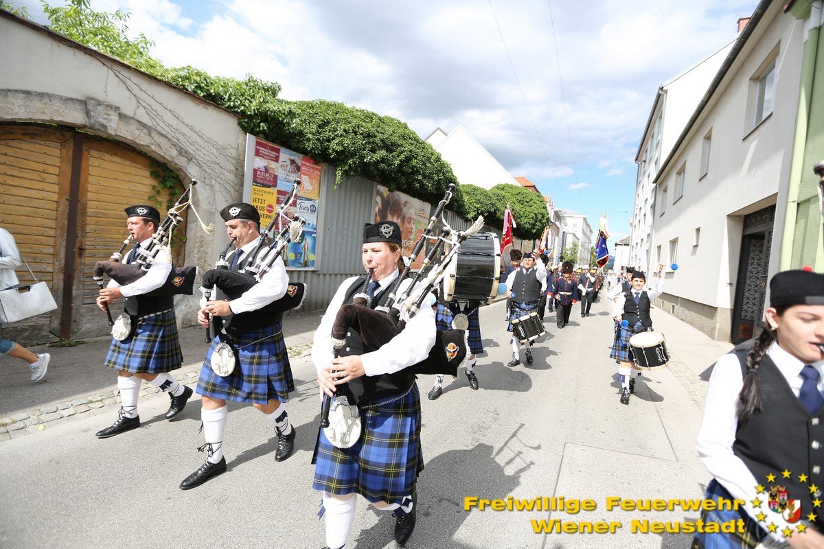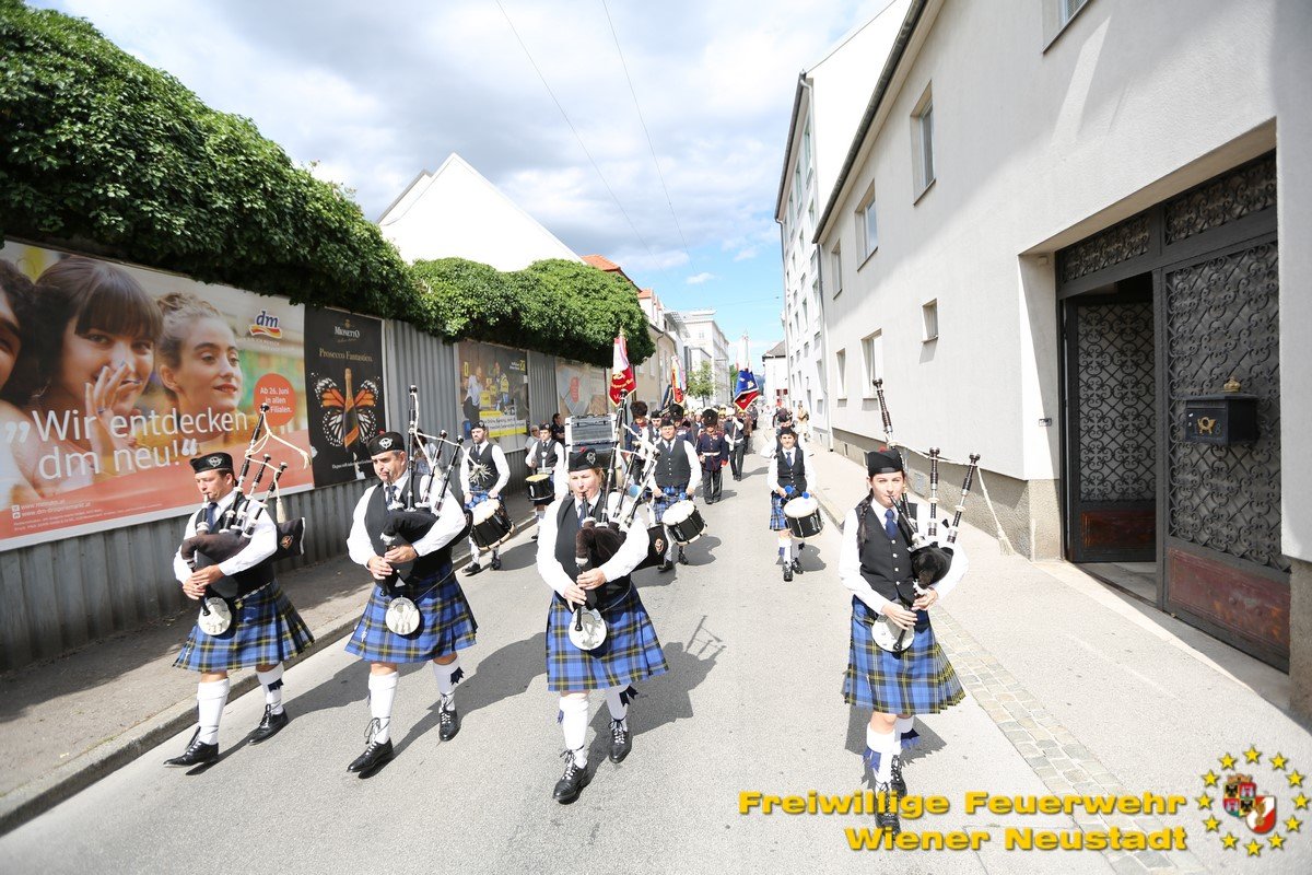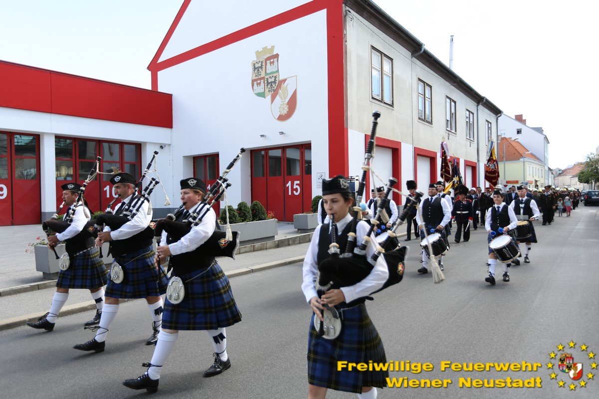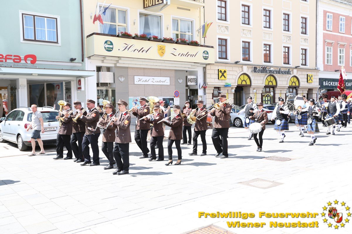 Am Samstag fand am Morgen am Hauptplatz, direkt vor dem neugestalteten Marienplatz, der Hauptrapport statt. Über 300 Feuerwehrmitglieder bildeten den Marschblock begleiteten doch die Kameradinnen und Kameraden der Feuerwehren der Neustädte in Europa die Mitglieder der Feuerwehr Wiener Neustadt. Angeführt wurde der Marschblock von der Eisenbahnermusik Flugrad und den Caledonian Pipes and Drums Burgenland, die in einem genialen Duett der beiden Ensembles, auch während des Hauptrapports die hunderte Zuschauer aus der Bevölkerung begeisterten.