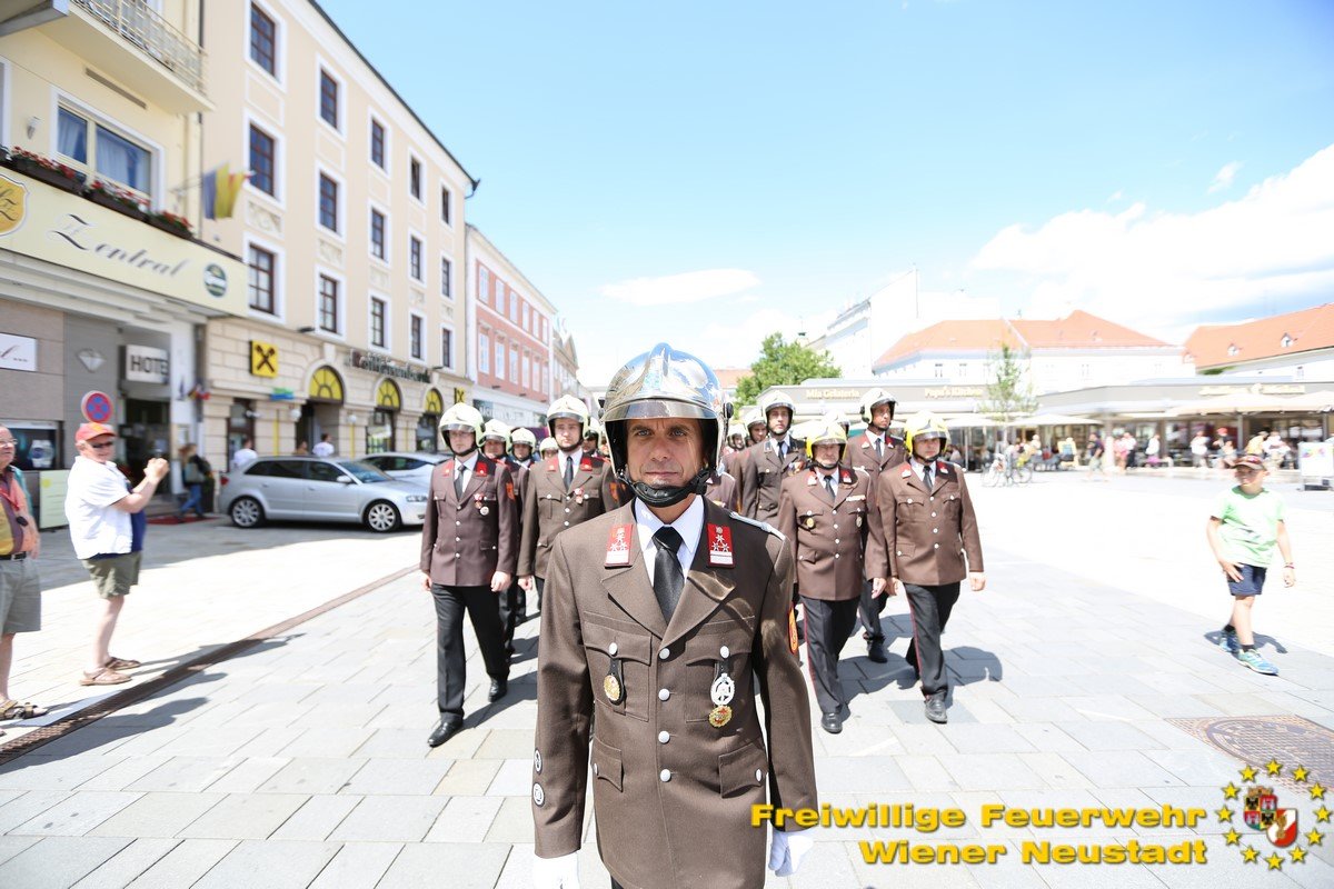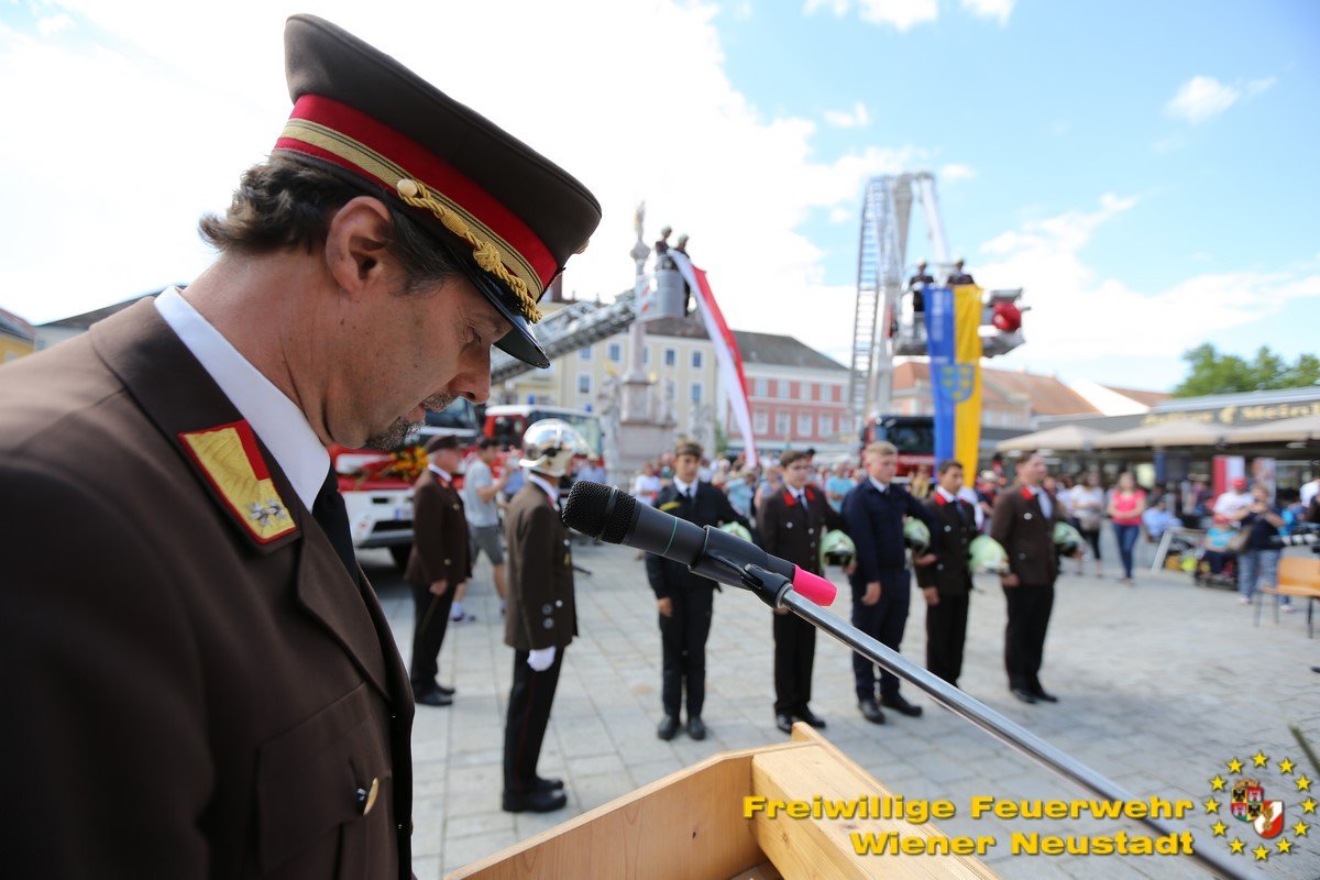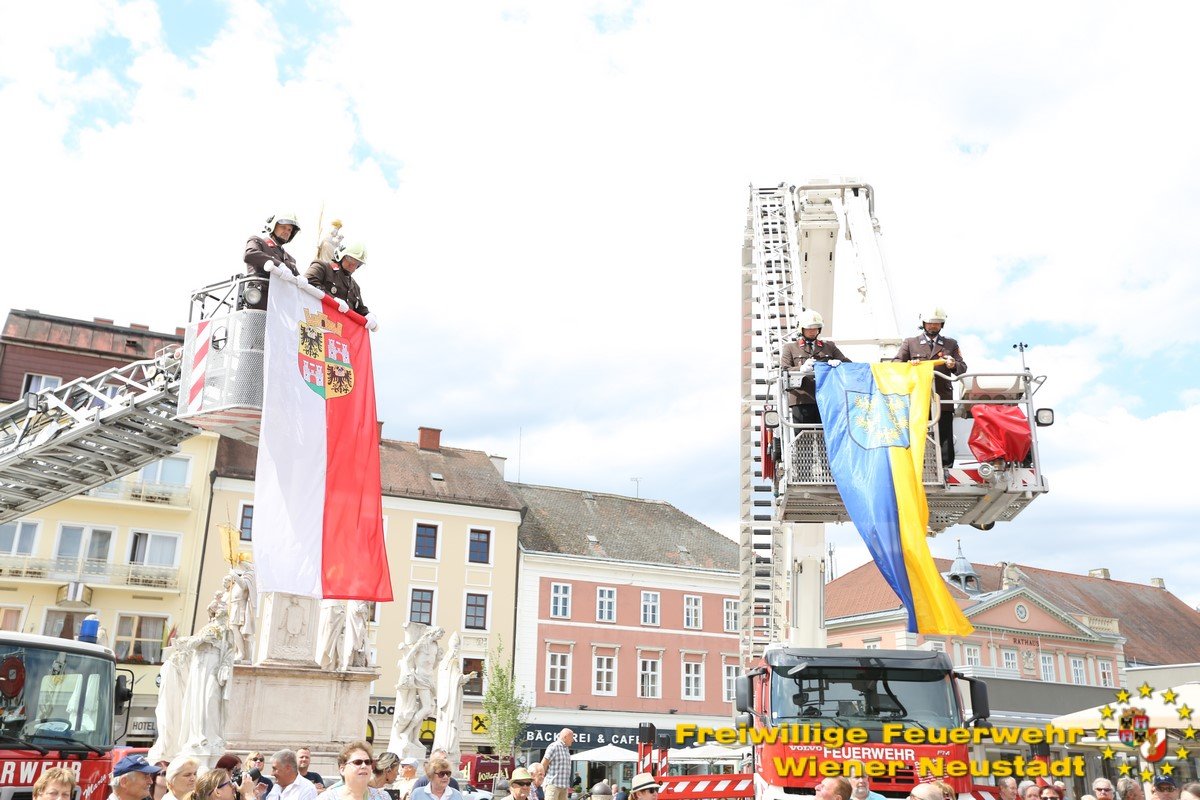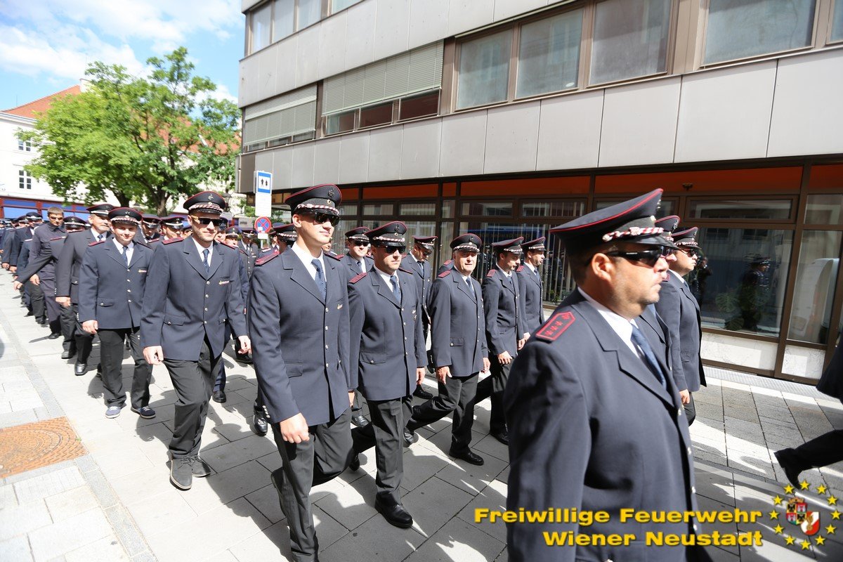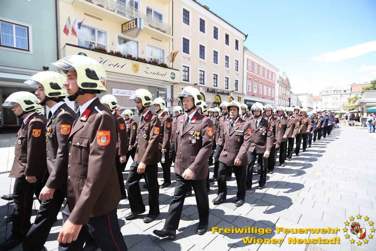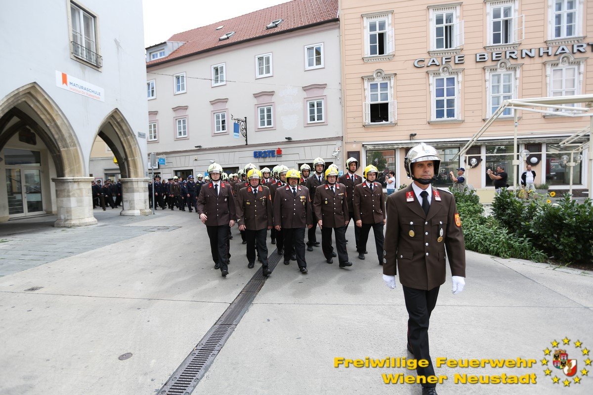 Am Samstag fand am Morgen am Hauptplatz, direkt vor dem neugestalteten Marienplatz, der Hauptrapport statt. Über 300 Feuerwehrmitglieder bildeten den Marschblock begleiteten doch die Kameradinnen und Kameraden der Feuerwehren der Neustädte in Europa die Mitglieder der Feuerwehr Wiener Neustadt. Angeführt wurde der Marschblock von der Eisenbahnermusik Flugrad und den Caledonian Pipes and Drums Burgenland, die in einem genialen Duett der beiden Ensembles, auch während des Hauptrapports die hunderte Zuschauer aus der Bevölkerung begeisterten.