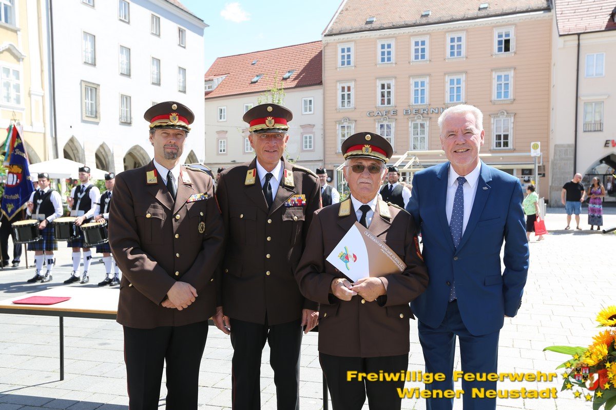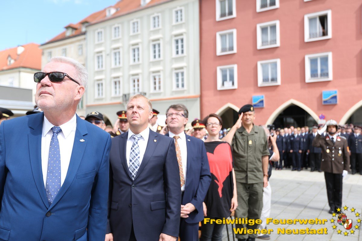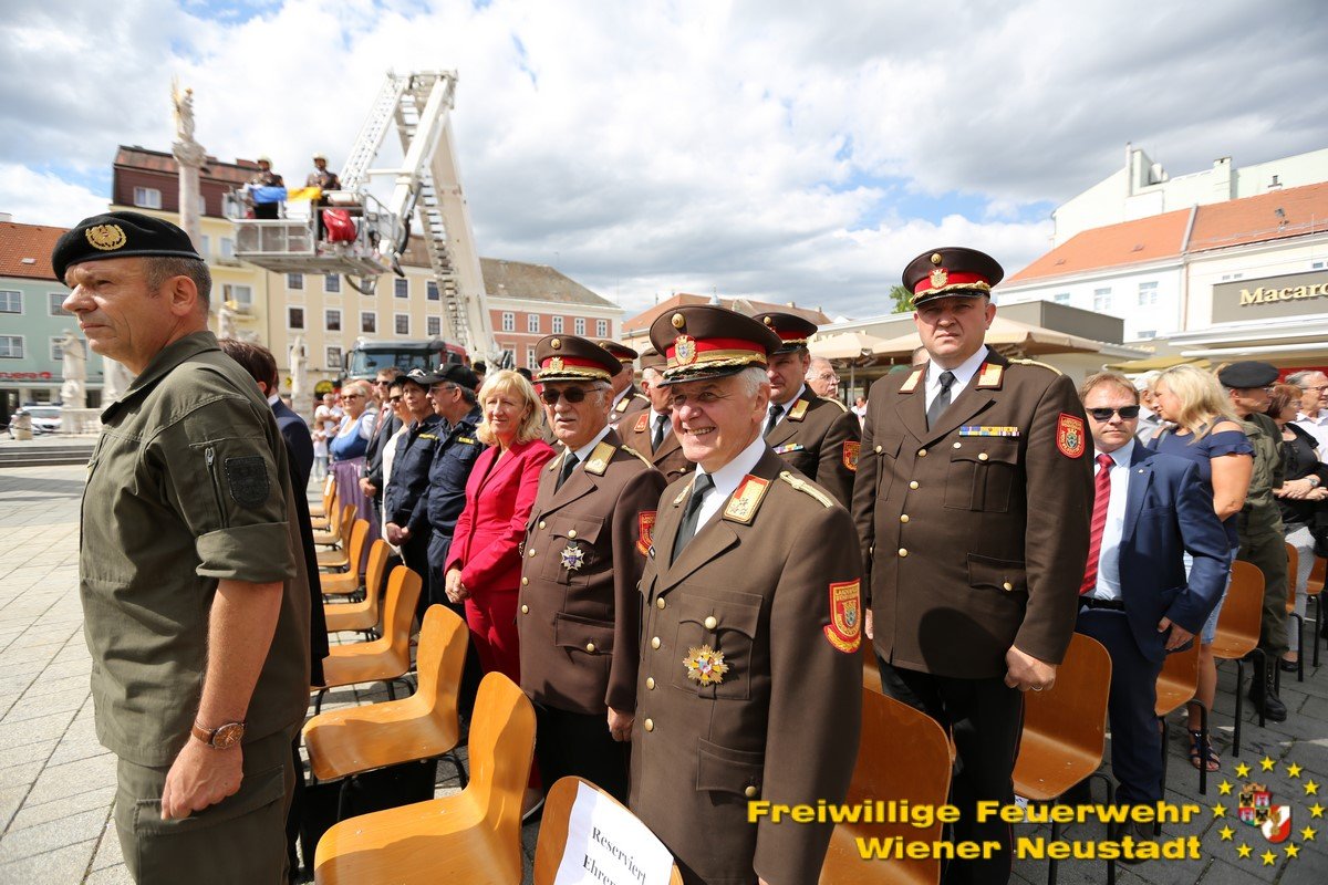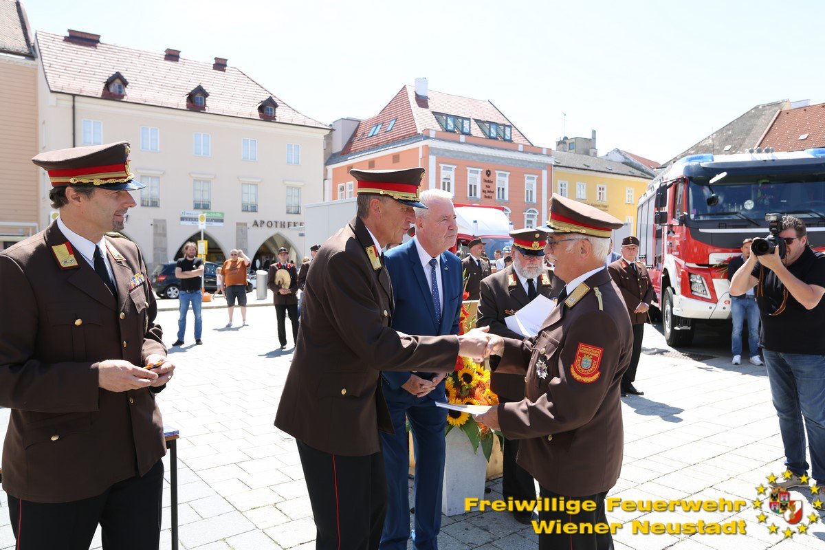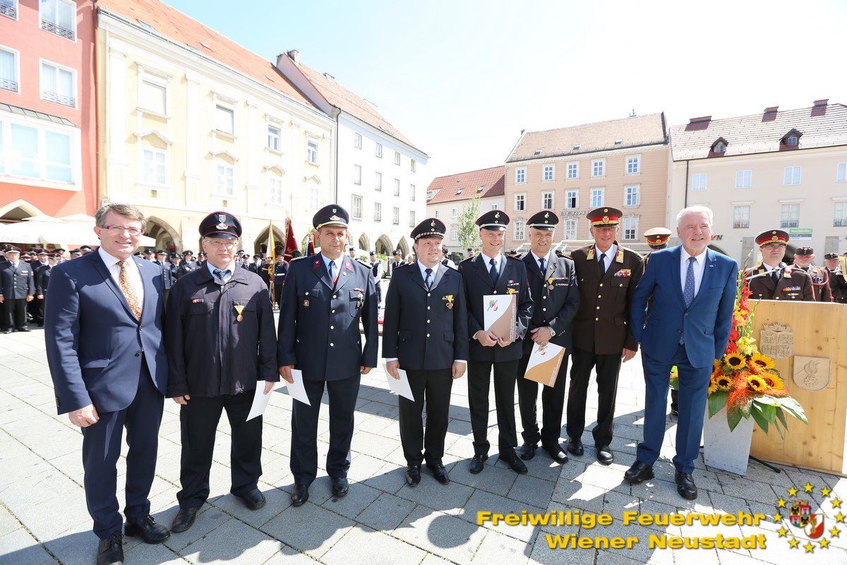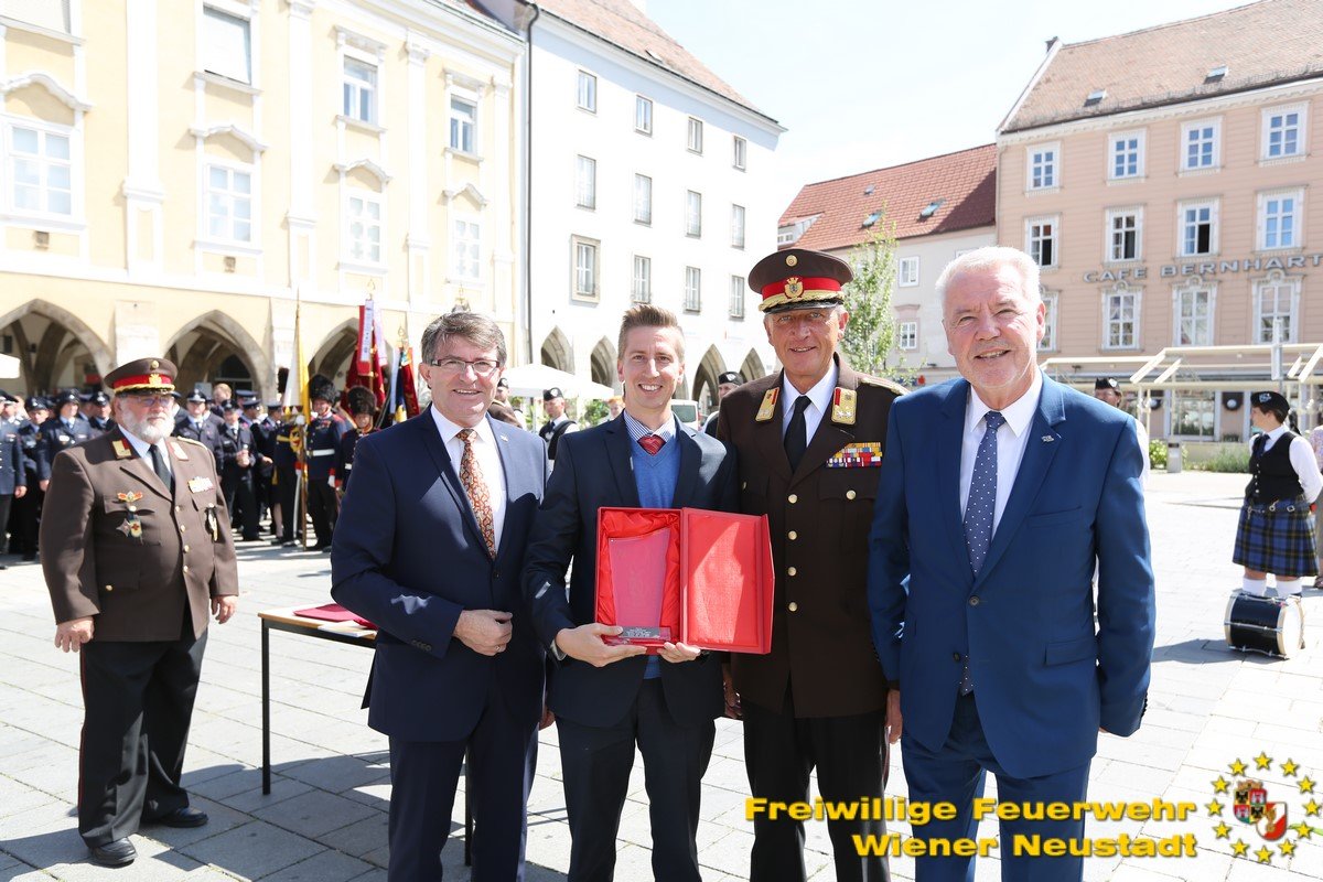 Viele Kameraden wurden geehrt und man ließ es sich nicht nehmen für Verdienste um die Internationale Kooperation auch Gäste aus den Neustädten Europas zu Ehren. Auch aus der Wirtschaft durfte eine hohe Auszeichnung vergeben werden: Dr. Philipp Jaklin von der Firma Jamal wurde die Florianiplakette des NÖ Landesfeuerwehrverbandes Clubobmann und Bürgermeister Klaus Schneeberger überreicht wurde. Dieser wurde ebenfalls geehrt und mit der höchsten Auszeichnung überrascht, die das Feuerwehrwesen einem Zivilisten übergeben kann. Bezirksfeuerwehrkommandant-Stv. und Wr. Neustädter Feuerwehrkommandant Josef Bugnar überreichte Bürgermeister Schneeberger die Florianiplakette des Österreichischen Bundesfeuerwehrverbandes, der Dachorganisation aller Feuerwehren Österreichs.
