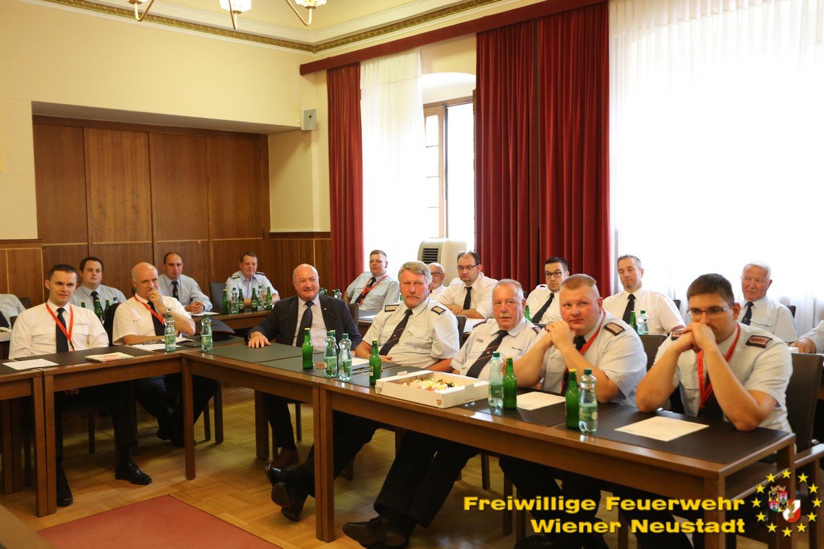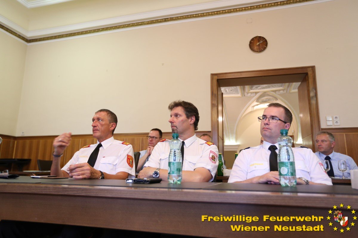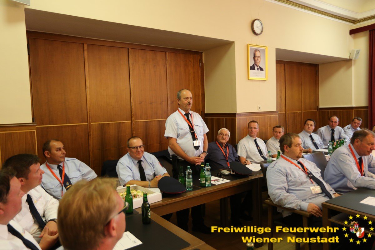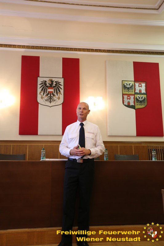 Es ist toll, was Wiener Neustadt hier auf die Beine gestellt hat. Die Festlichkeit und auch der würdige Rahmen des Hauptrapports haben uns als Gäste sehr beeindruckt. Die tolle Ausrückzeit der Feuerwehr konnten wir bei einigen Einsätzen live miterleben. Die Stadt kann auf ihre Männer der Feuerwehr Wiener Neustadt stolz sein, würdigte Armin Bindel von der Feuerwehr Waiblingen Neustadt, der Vorsitzende des Arbeitskreises Feuerwehren Neustadt in Europa, während seiner Rede im großen Sitzungssaal im alten Rathaus, welcher freundlicherweise für die Arbeitskreissitzung der Feuerwehren der Neustädte in Europa zur Verfügung gestellt wurde. Erster Vizebürgermeister Dr. Christian Stocker führte in seiner dortigen Ansprache auch die Gäste in die Geschichte der Stadt Wiener Neustadt ein.