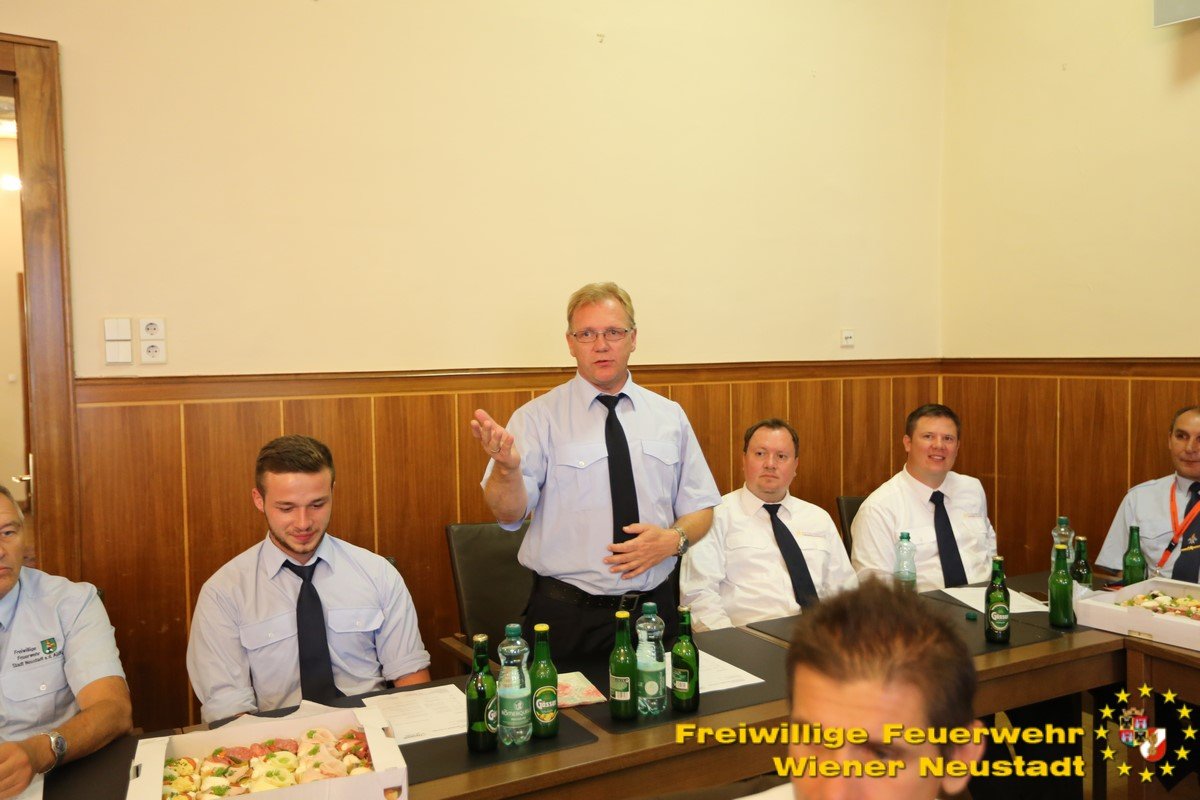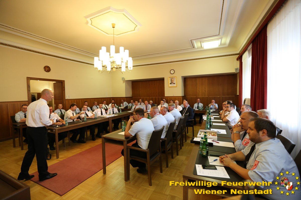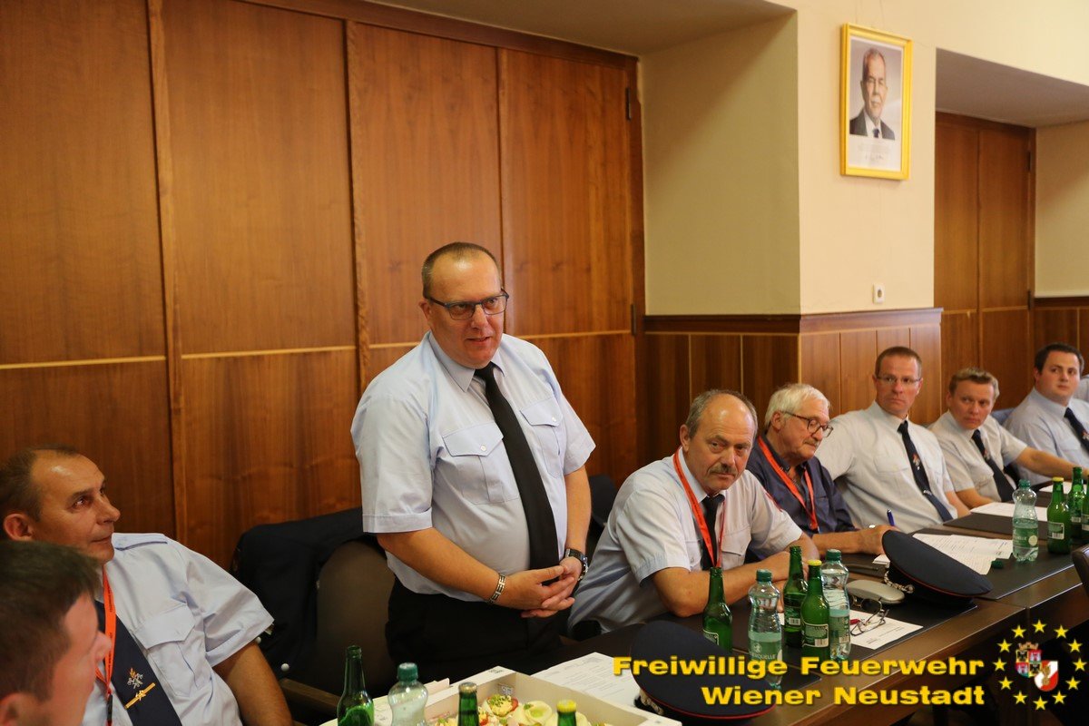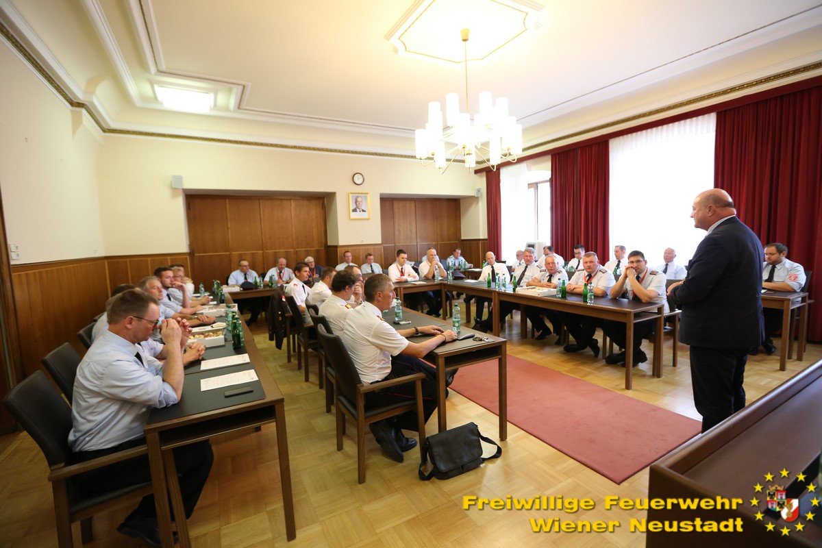 Es ist toll, was Wiener Neustadt hier auf die Beine gestellt hat. Die Festlichkeit und auch der würdige Rahmen des Hauptrapports haben uns als Gäste sehr beeindruckt. Die tolle Ausrückzeit der Feuerwehr konnten wir bei einigen Einsätzen live miterleben. Die Stadt kann auf ihre Männer der Feuerwehr Wiener Neustadt stolz sein, würdigte Armin Bindel von der Feuerwehr Waiblingen Neustadt, der Vorsitzende des Arbeitskreises Feuerwehren Neustadt in Europa, während seiner Rede im großen Sitzungssaal im alten Rathaus, welcher freundlicherweise für die Arbeitskreissitzung der Feuerwehren der Neustädte in Europa zur Verfügung gestellt wurde. Erster Vizebürgermeister Dr. Christian Stocker führte in seiner dortigen Ansprache auch die Gäste in die Geschichte der Stadt Wiener Neustadt ein.