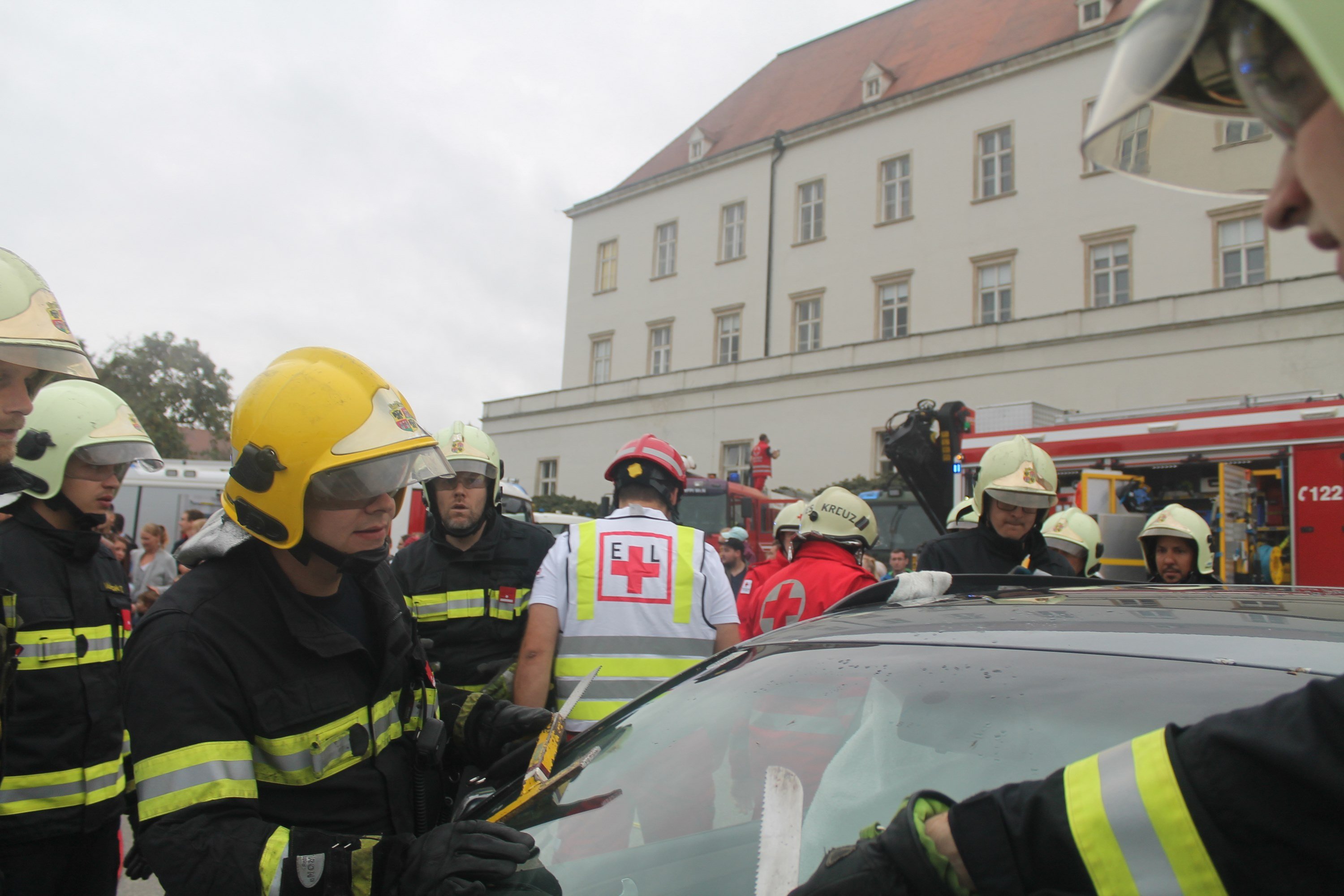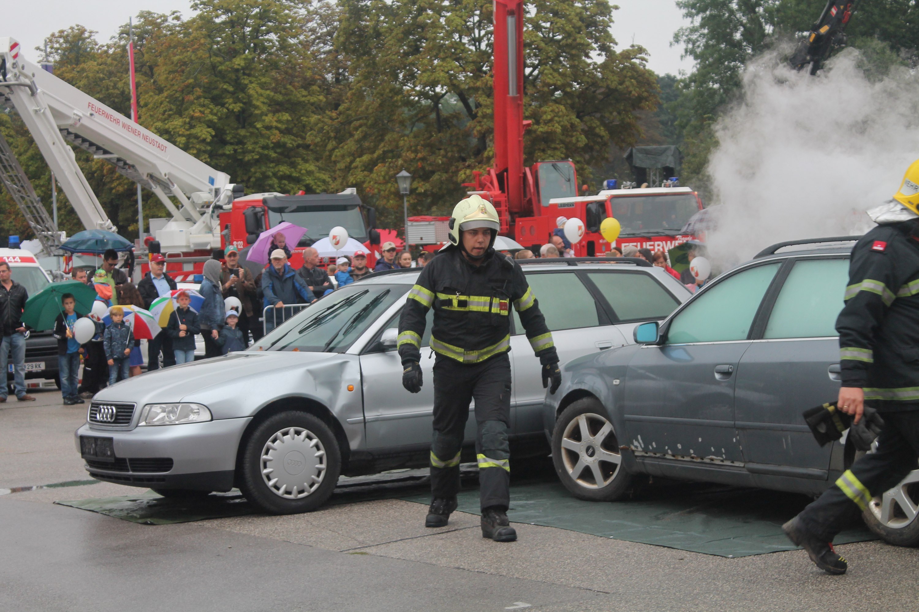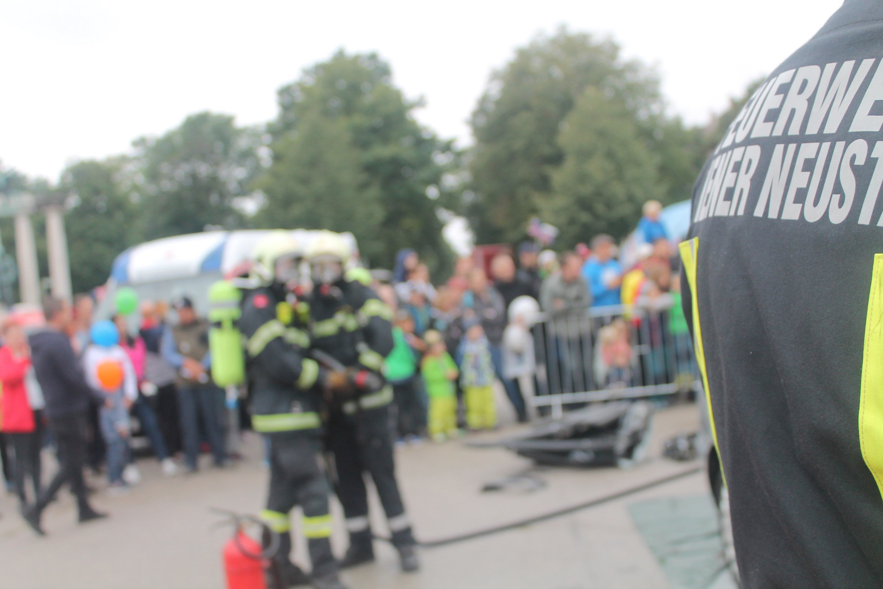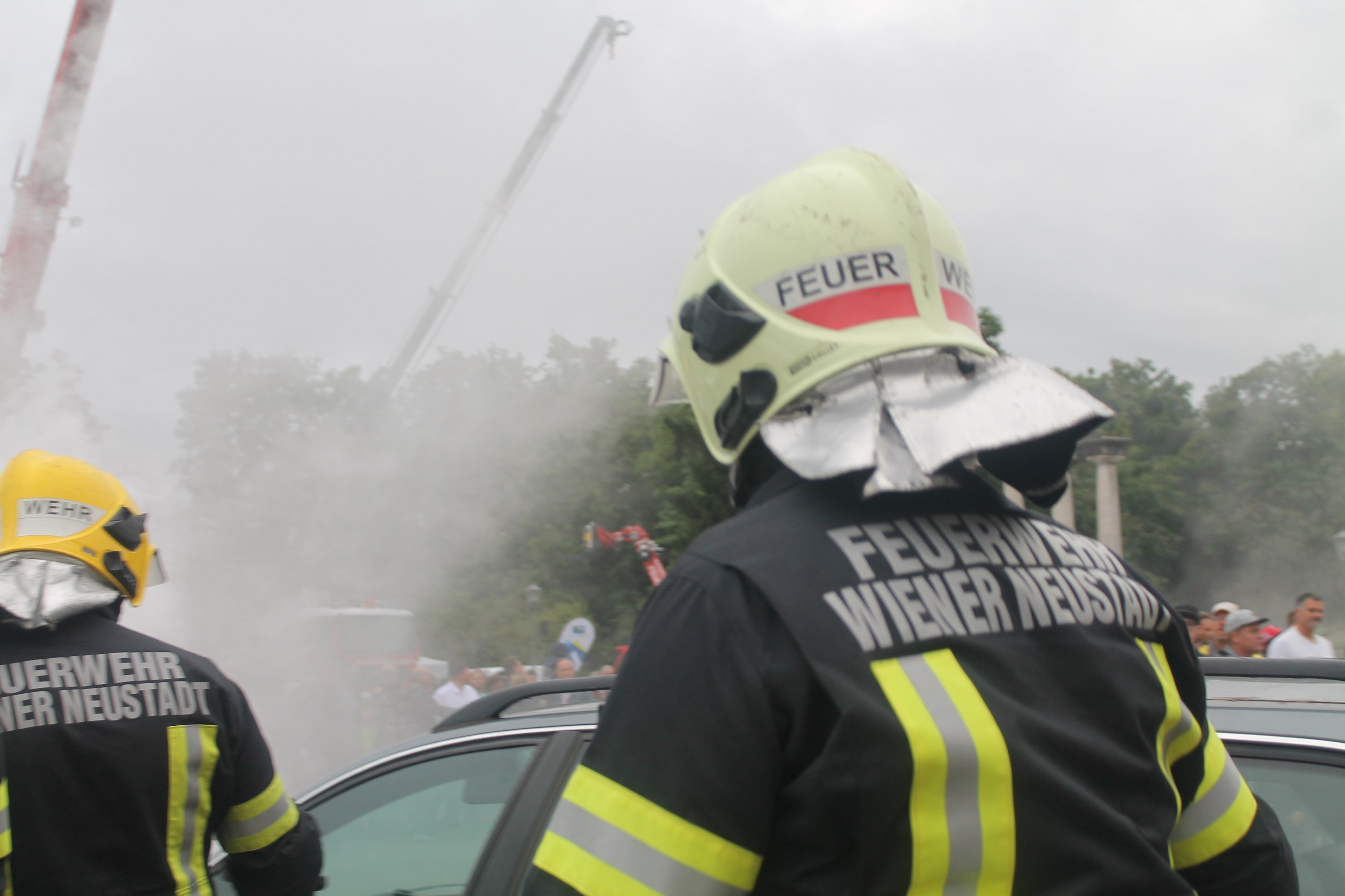 Mit 38 Mann und 18 Fahrzeugen konnte die Freiwillige Feuerwehr Wiener Neustadt das volle Spektrum der Aufgaben präsentieren. Bei zwei Übungen konnte in Zusammenarbeit mit dem Roten Kreuz den Besucherinnen und Besuchern hautnah die professionelle Arbeitsweise präsentiert werden. In gewohnter Doppelconference präsentierten Wolfgang Ledwinka vom Roten Kreuz und Richard Berger von der FF Wr. Neustadt die jeweiligen Aufgaben, die Arbeitsweise, die jeweilige Organisation sowie jene Dinge, welche man sonst nicht so einfach über die beiden ehrenamtlichen Einsatzorganisationen erfährt.