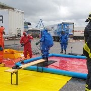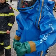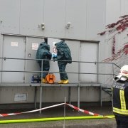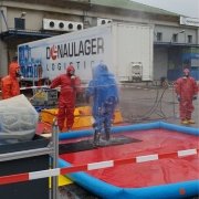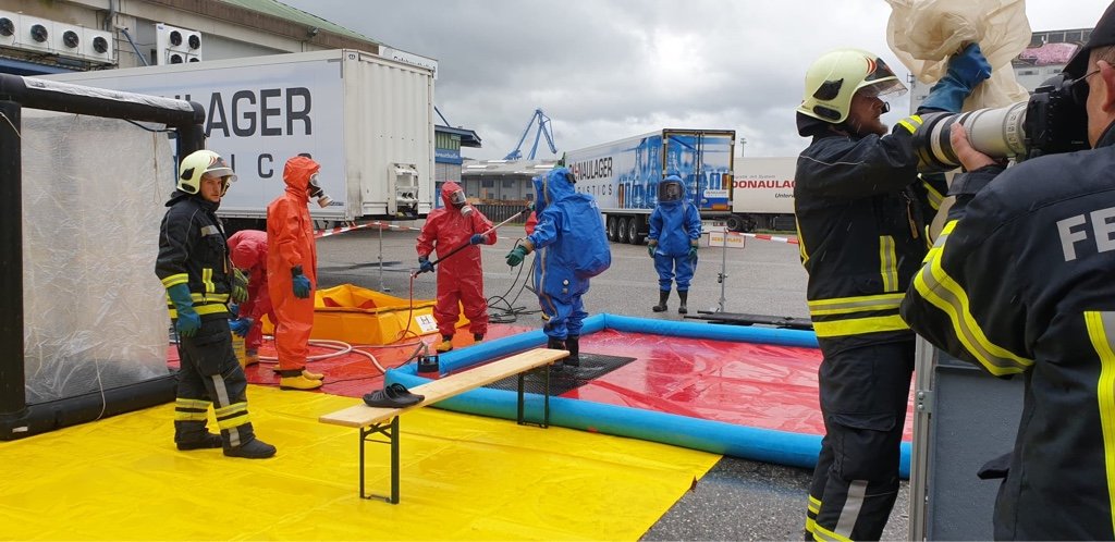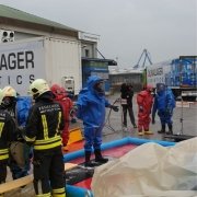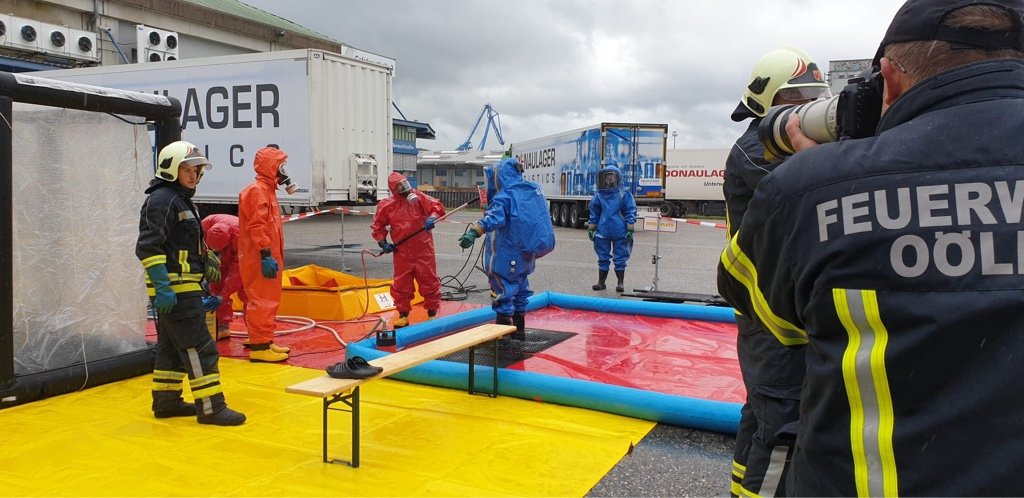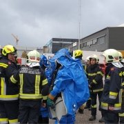Auf einem Firmengelände kam es bei Räumarbeiten zu einem Schadstoffaustritt. Die Feuerwehreinheiten bekamen den Einsatzbefehl, den Austritt dieser gefährlichen Stoffe einzudämmen und die weiteren Räumungsmaßnahmen durchzuführen. Abschließend zu diesem Szenario wurden die notwendigen Dekontaminationsmaßnahmen gesetzt.