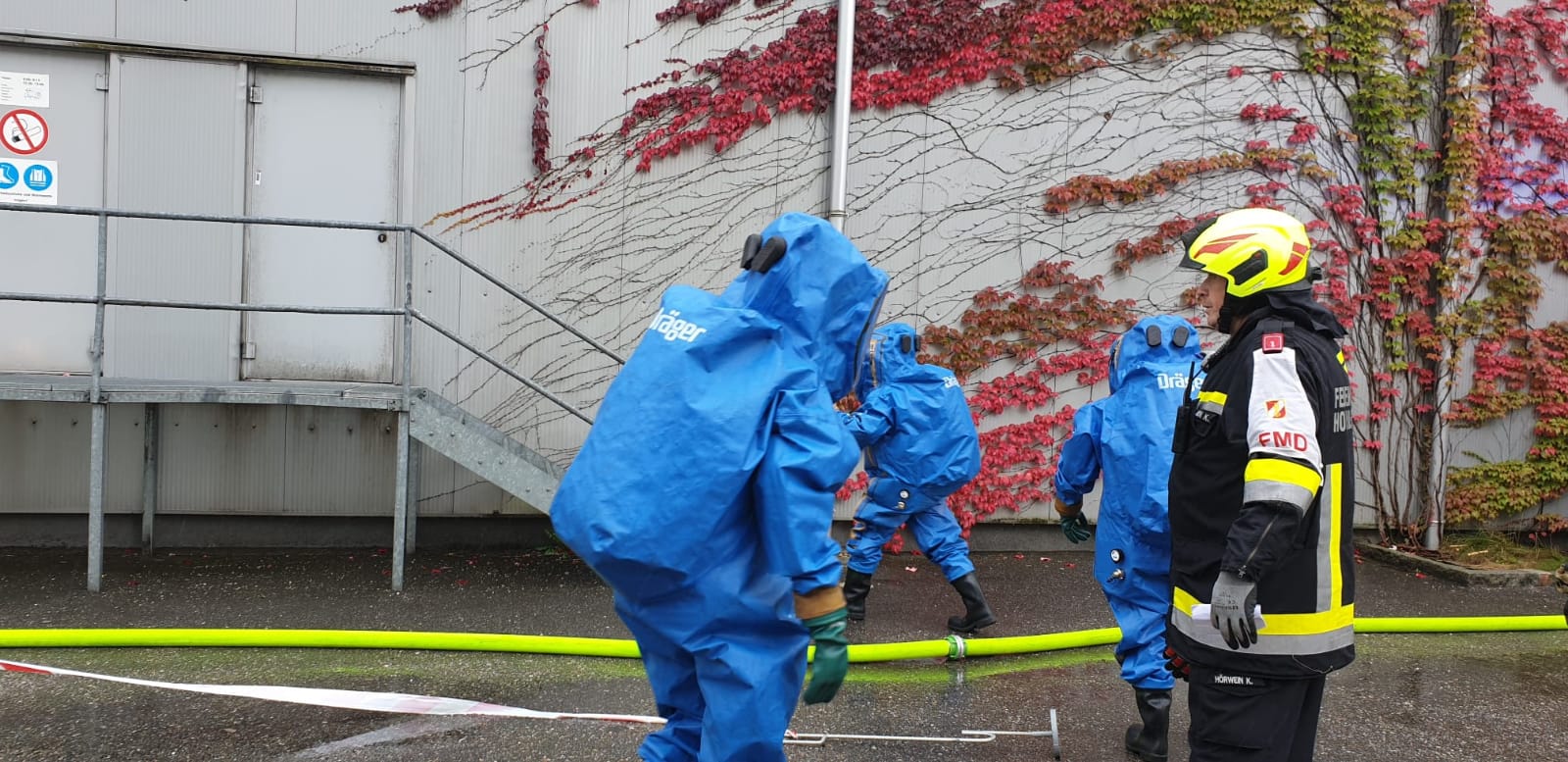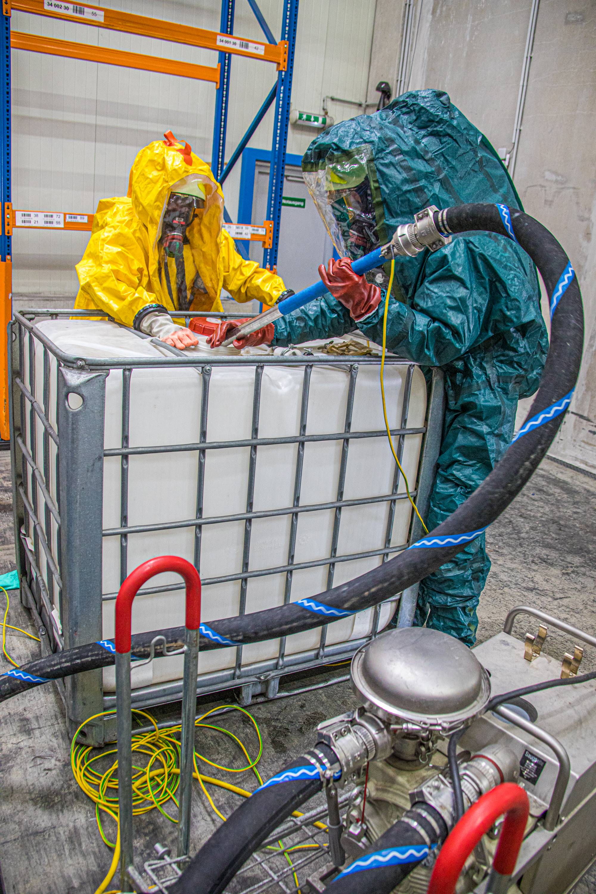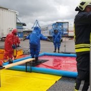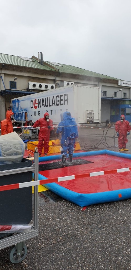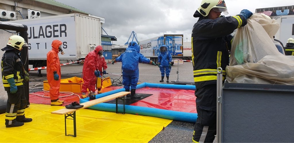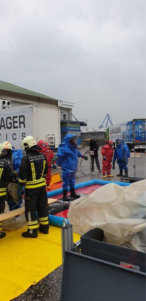 Die Aufgabe der Freiwilligen Feuerwehr war es mit gasdichten Schutzanzügen die Erkundung sowie die Bergung der Gefahrgüter durchzuführen.