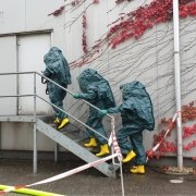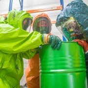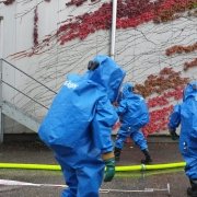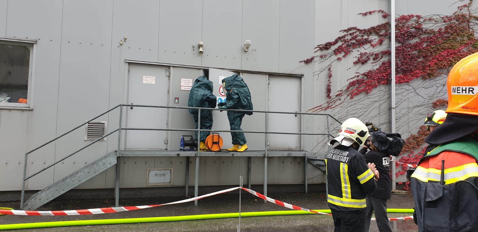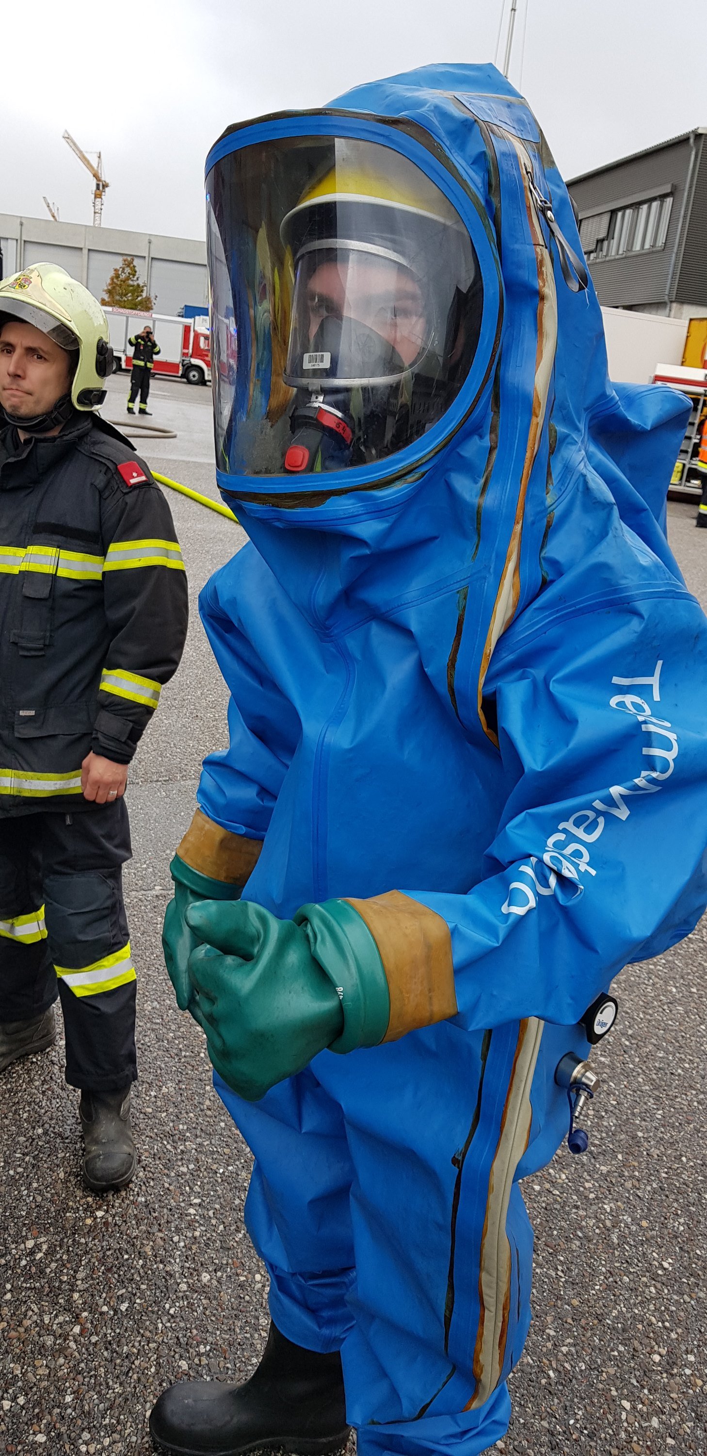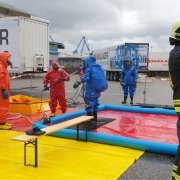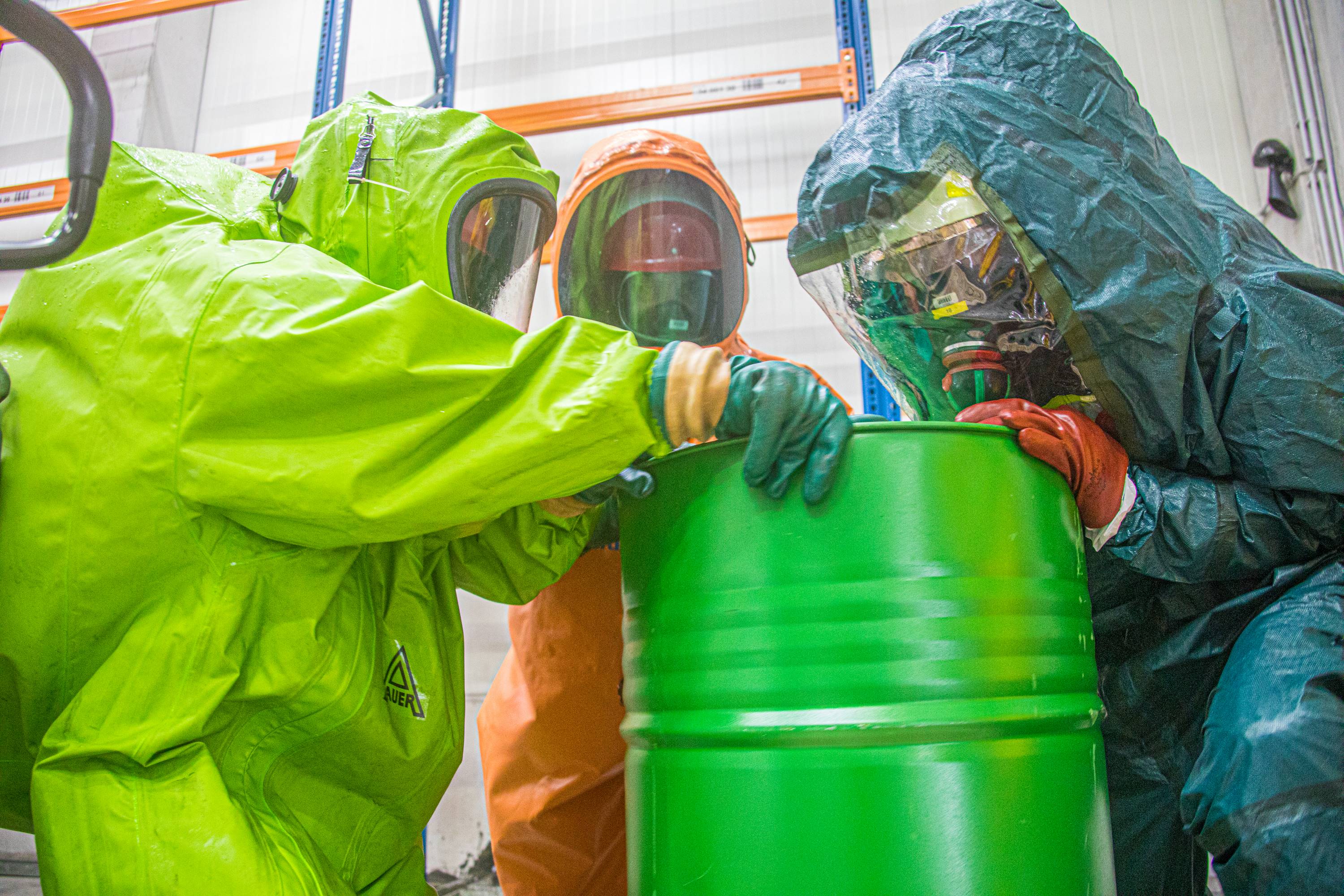 Die Aufgabe der Freiwilligen Feuerwehr war es mit gasdichten Schutzanzügen die Erkundung sowie die Bergung der Gefahrgüter durchzuführen.