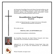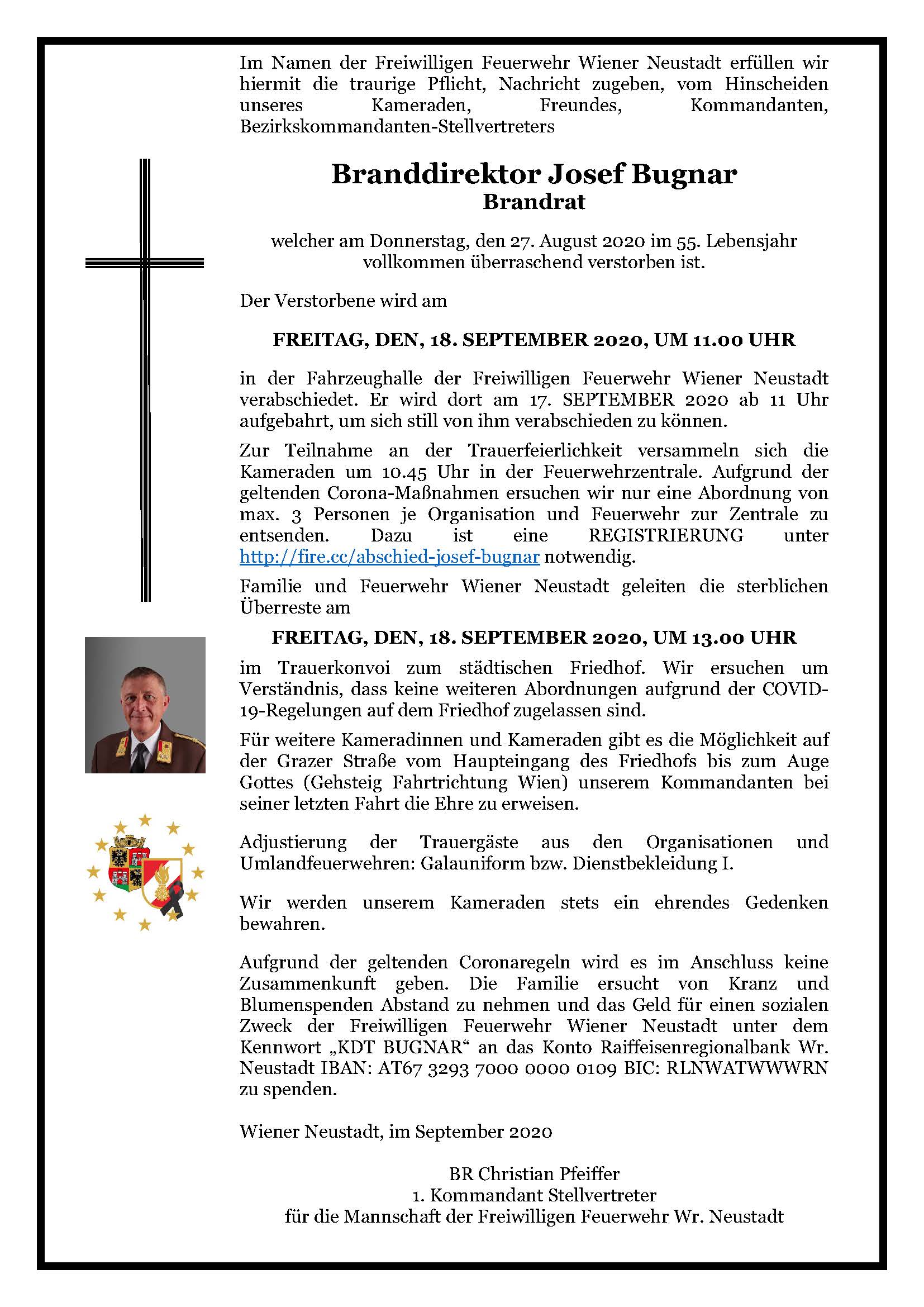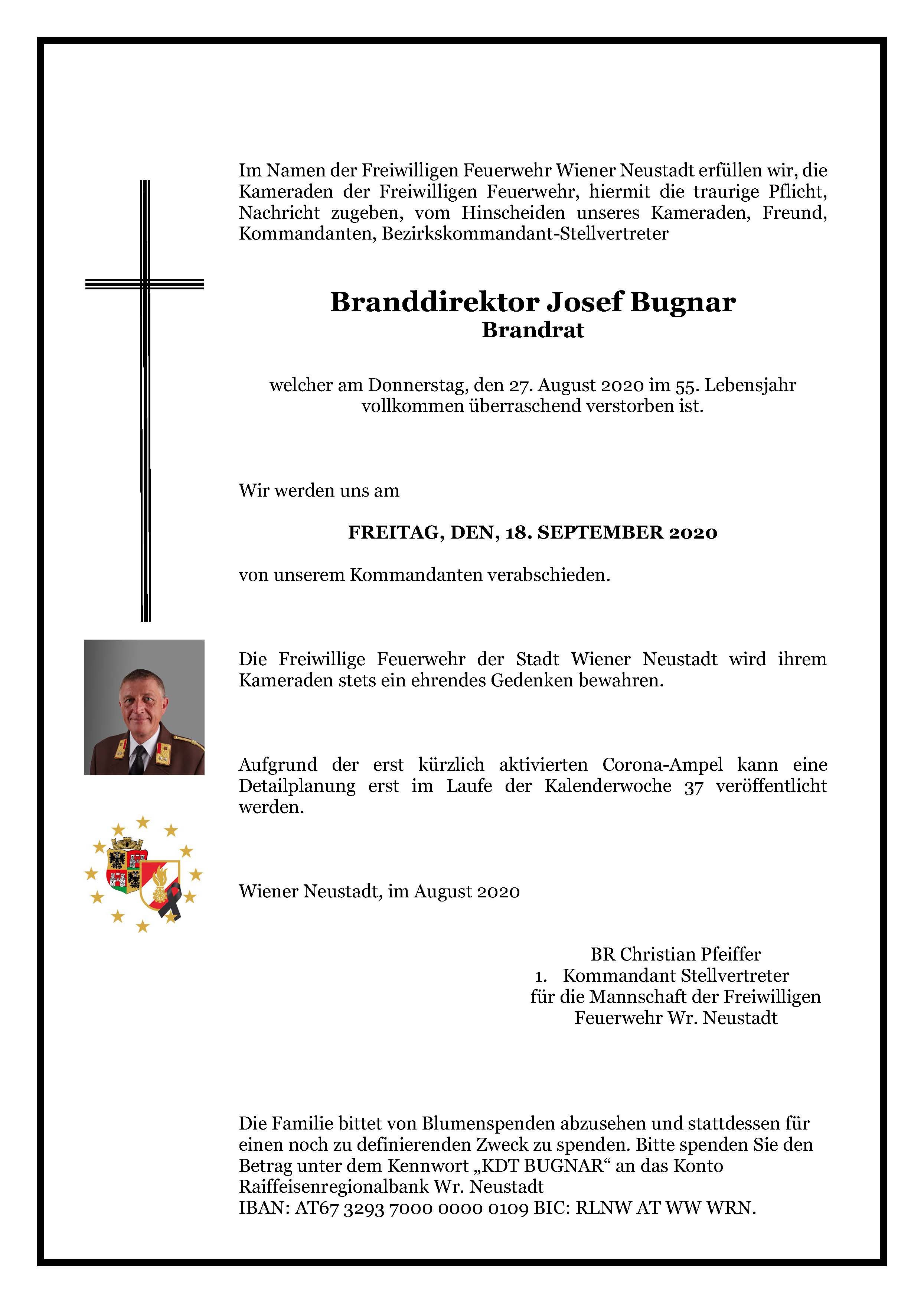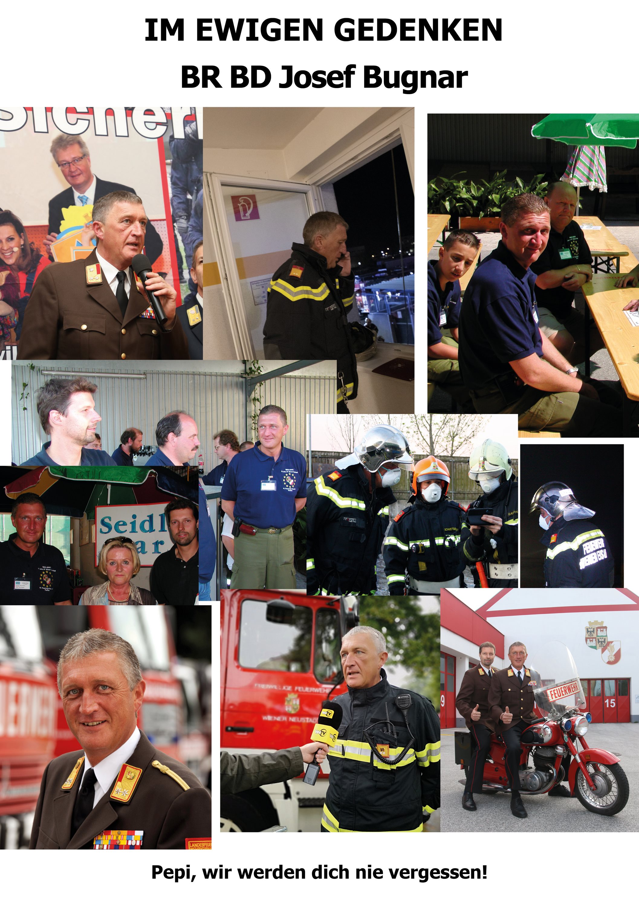 Geschockt und erschüttert hat uns die Nachricht vom plötzlichen und unvorhersehbaren Ableben unseres geliebten Kommandanten Branddirektor Josef Bugnar erreicht. Unsere Anteilnahme gilt seinen Söhnen und seiner Ehefrau. Der Tod ist die Grenze des Lebens, nicht aber der Liebe…