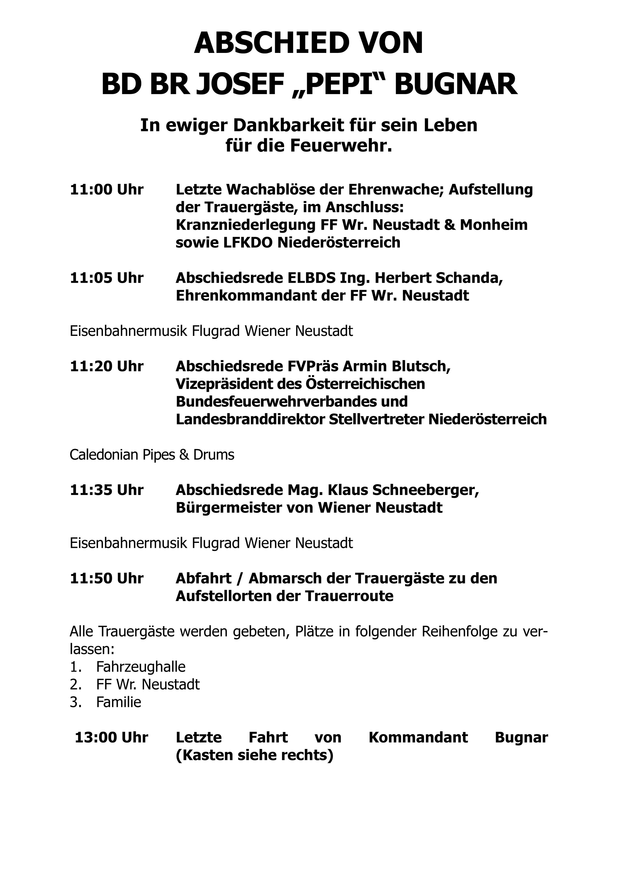 ELBDS Ing. Herbert Schanda, Ehrenkommandant der Freiwilligen Feuerwehr Wiener Neustadt wird die Tätigkeiten und Errungenschaften aber vor allem die Kameradschaft unseres Kommandanten in den Vordergrund seiner Rede stellen. Ihm folgend wird FVPräs Armin Blutsch, Vizepräsident des Österreichischen Bundesfeuerwehrverbandes und Landesfeuerwehrkommandant-Stellvertreter in Vertretung des Herrn Landesfeuerwehrkommandanten Dietmar Fahrafellner, die überörtlichen Tätigkeiten und das völkerverbindende Wesen von Branddirektor Josef Bugnar in den Mittelpunkt stellen. Zuletzt spricht unser geschätzter Herr Bürgermeister, Herr Mag. Klaus Schneeberger, über die Arbeit von Pepi Bugnar als Magistratsbediensteten und obersten Brandschützer der Statutarstadt Wiener Neustadt. Untermalt wird die Verabschiedung durch die Abordnung der Eisenbahnermusik Flugrad unter der Leitung von Kapellmeister Hermann Schmid. Zudem werden die Caledonian Pipes & Drums Burgenland ein Abschiedslied für den allseits beliebten Kommandanten der Neustädter Feuerwehr spielen.