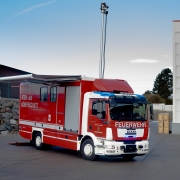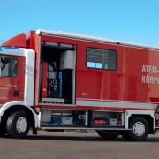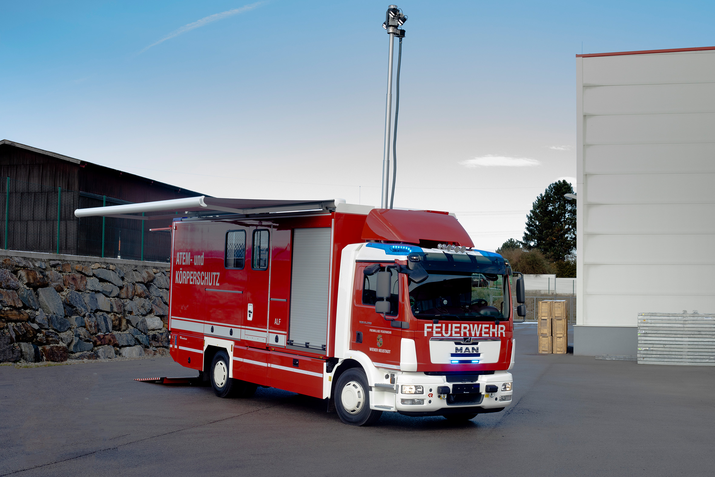 Der Kofferaufbau in (Alu-Sandwich Bauweise) ist in 3 Bereiche gegliedert: Technikebene, Arbeitsraum und Geräteraum. Mit einem 40 kVA Einbaugenerator wird die halbautomatische Atemluftkompressoranlage betrieben sowie sämtliche stromverbrauchende Gerätschaften des Fahrzeuges wie zum Beispiel die Umfeldbeleuchtung und der Lichtmast, welcher eine grüne Blitzleuchte zur Kennzeichnung des Atemschutzsammelplatzes sowie die Luft-Ansaugung für den Atemluftkompressor beinhaltet. Der leistungsstarke Lichtmast kann die Einsatzstelle in der Nacht im Umkreis von ca. 25 Meter in alle Richtungen bestens ausleuchten.