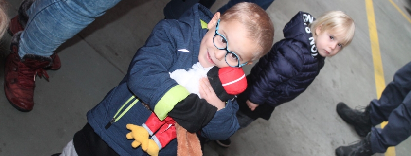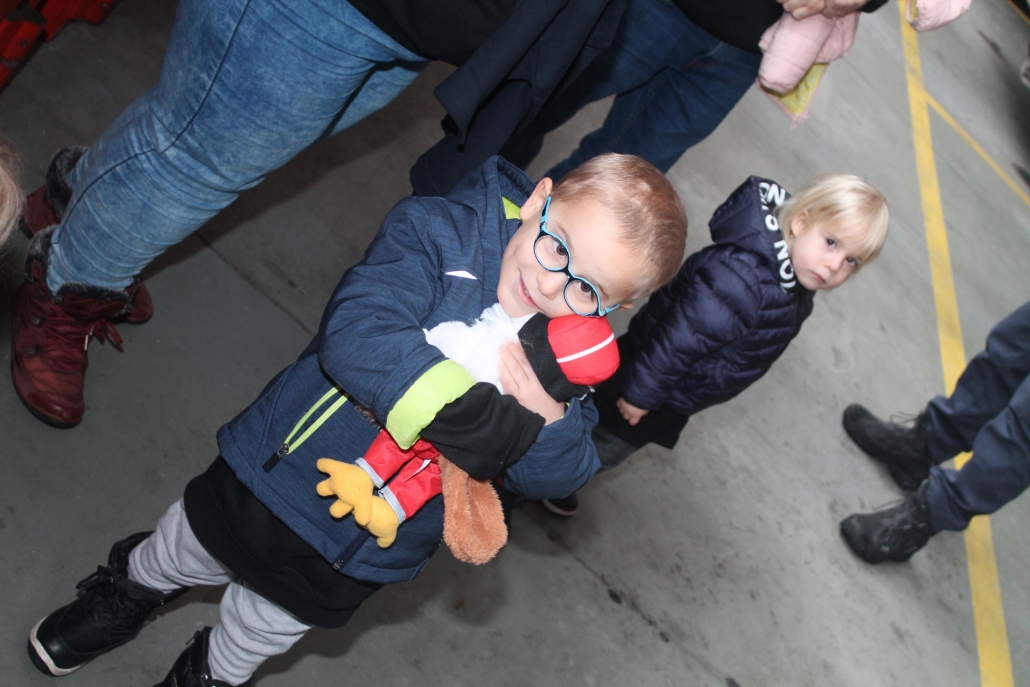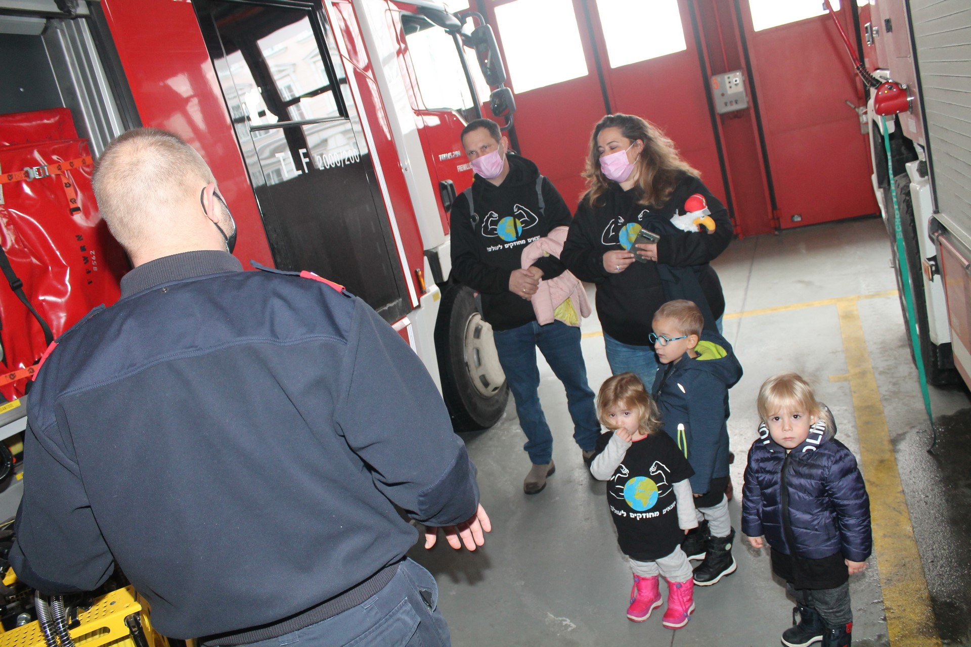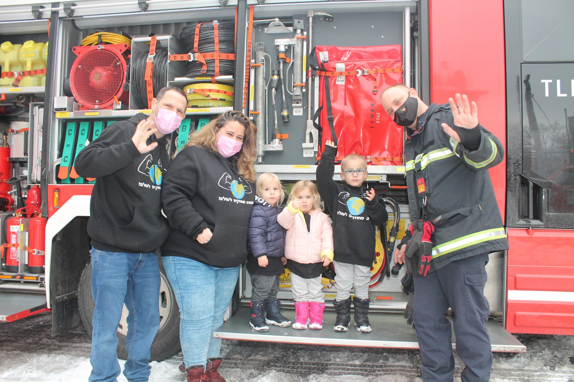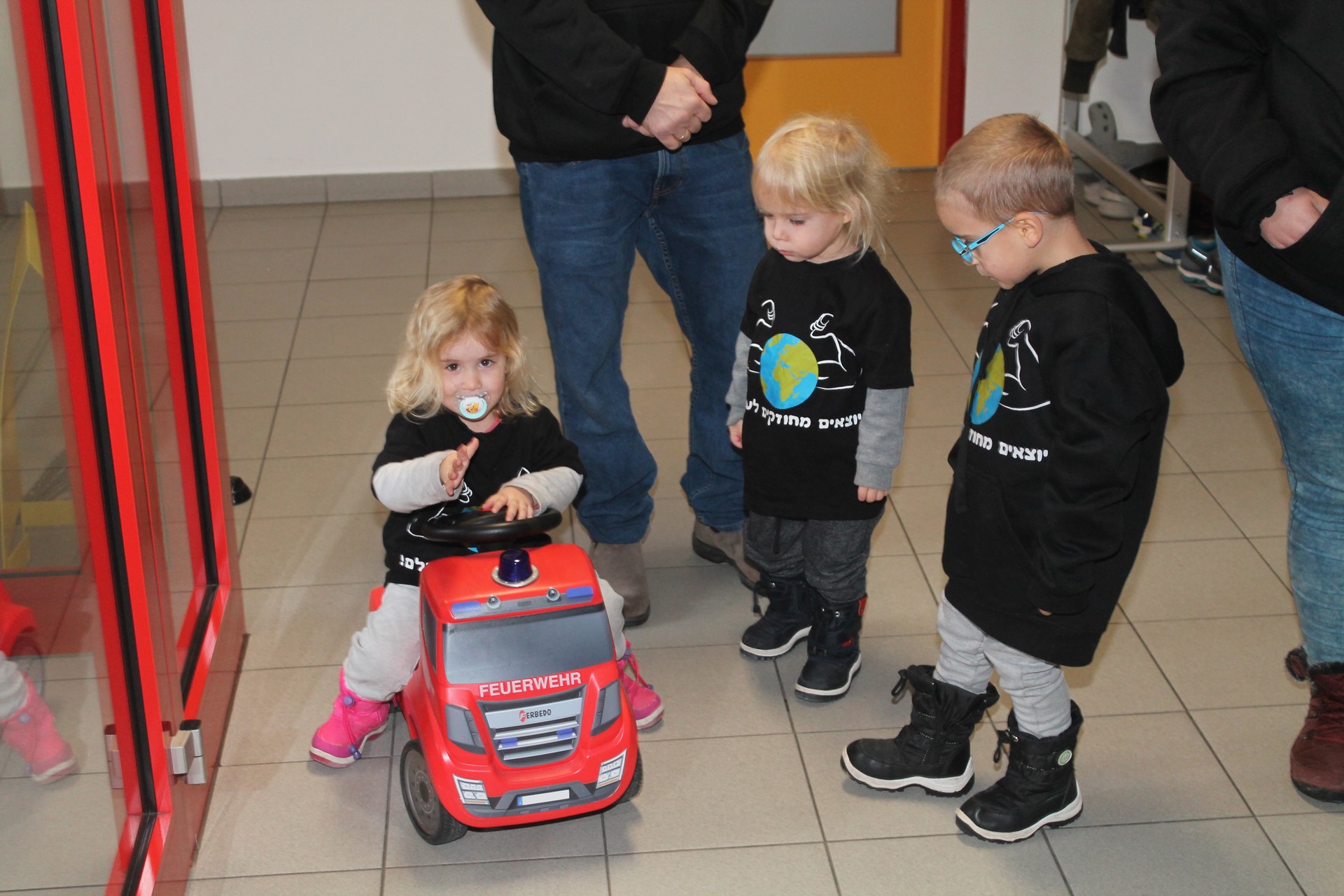 Der Ausflug startete für Adam, seine beiden jüngeren Geschwister und die Eltern in der Fahrzeughalle. Die Kinder bestaunten die großen und kleinen Feuerwehrfahrzeuge, deren Reifen oft größer waren, als sie selbst. Natürlich durfte in mehreren Fahrzeugen probegesessen und die Funktion des Blaulichts getestet werden. Adams Mutter übersetzte die in Englisch durchgeführte Führung ins Hebräische. Besonders spannend für die Kinder war unser Kleinkindertransportfahrzeug, wo ausgiebig die Blaulichtanlage genutzt wurde.
